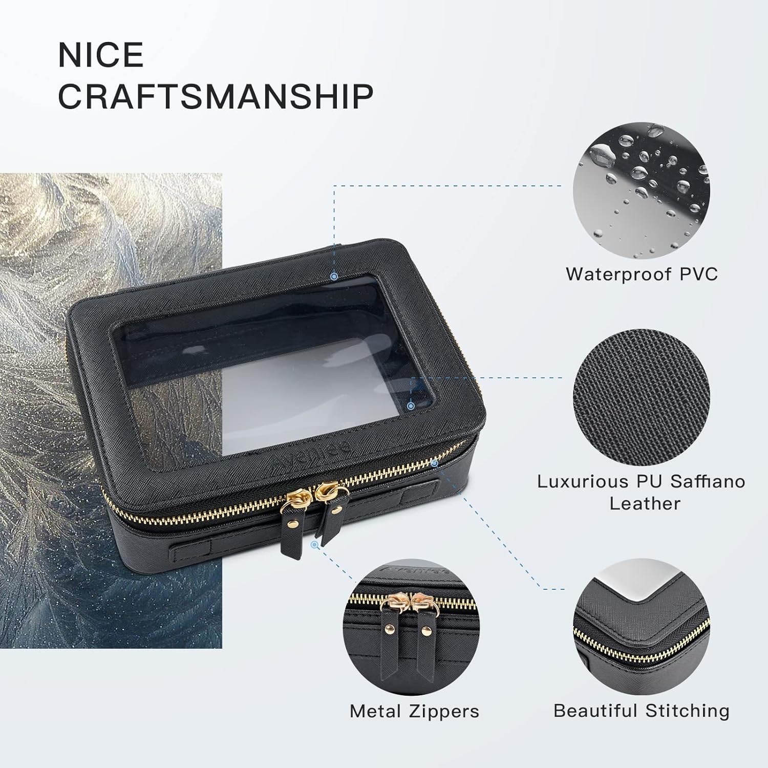 - ❤【LUXURY DESIGN】Measuring 9'' x 6.5'' x 3''(23cm x16.5cm x 7.8cm), our makeup bag is sleek and stylish, this makeup travel organizer was designed in a minimalist boxy shape and a cool black color. Crafted in beautiful PU leather and finished with polished hardware, it's the clear pouch you'd be happy with sitting out on display beside you.