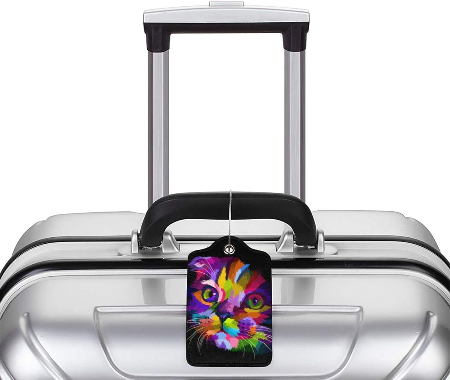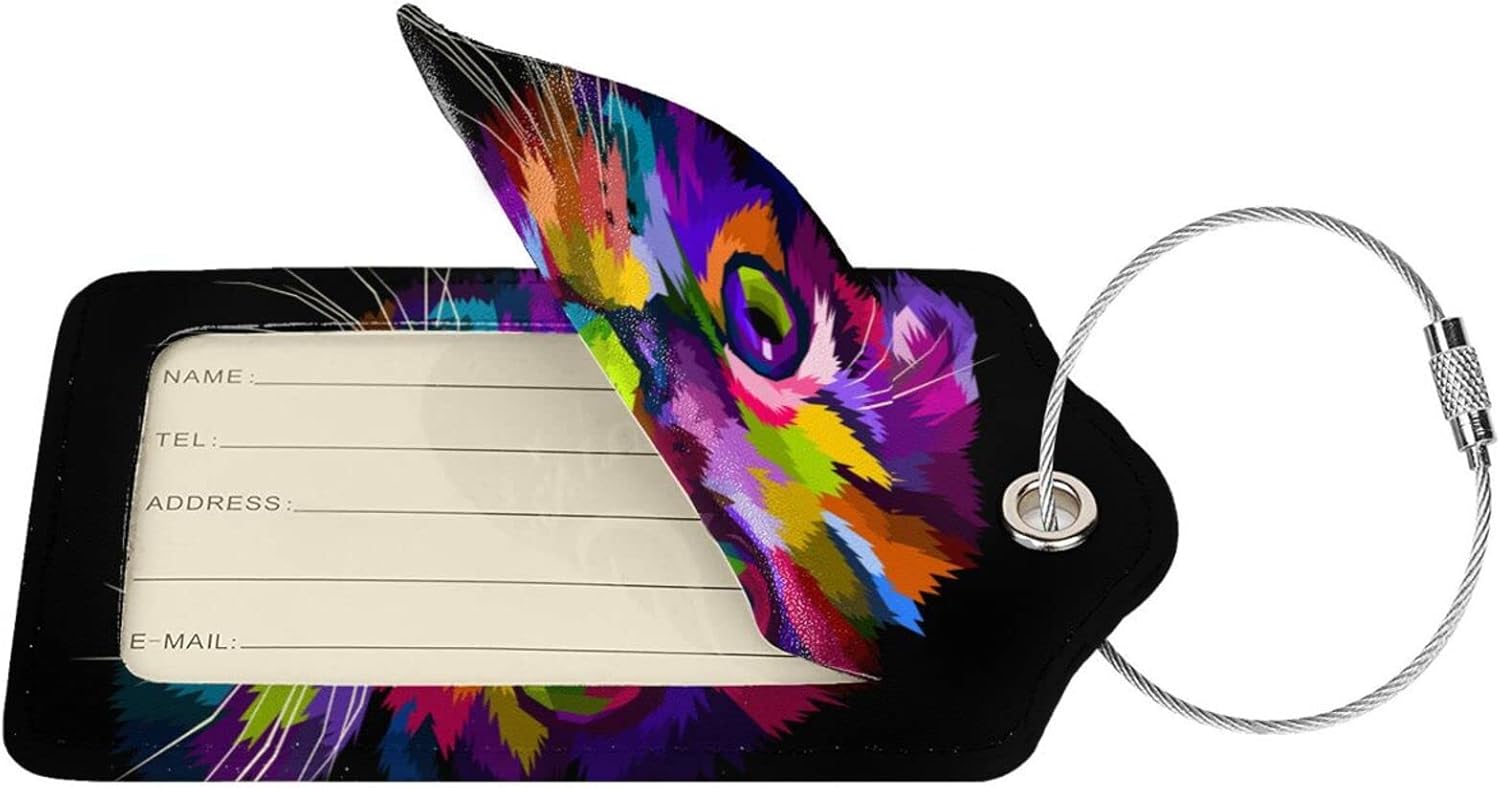 Cute Cat Leather Luggage Tags for Adults Teens, 2 Pack Colorful Art Kitten Animal Travel Bag Suitcase Labels with Stainless Steel Loop ID Tags Card Baggage Bag Label
