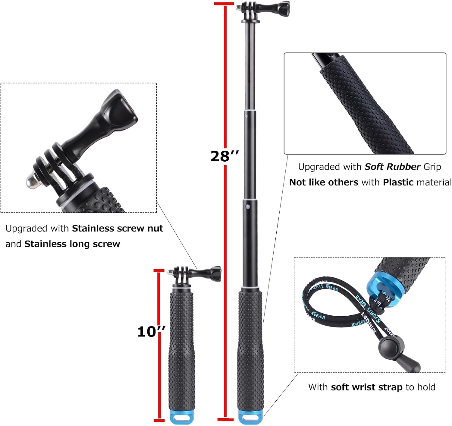 28” Extension Selfie Stick Compact Handle Grip Adjustable Pole Waterproof Monopod Accessories Compatible with GoPro Hero 13 12 11 10 9 8 7 6 Insta360 AKASO DJI Osmo Action Camera and More