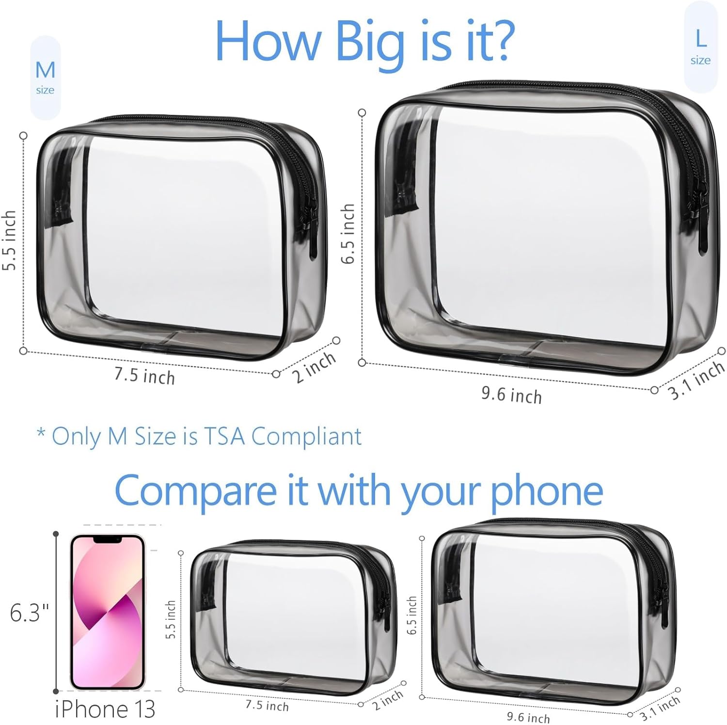 - TSA Approved, Meet Liquids Rule: The medium size clear makeup bag is 7.5 x 2.2 x 5.5 inch, it follows the TSA's 3-1-1 Liquid Rule published by TSA. You can quickly pass the airport security screening. Note: the large size clear bag is 9.6 x 3.1 x 6.5 inch, it is larger than one quart and is not TSA approved