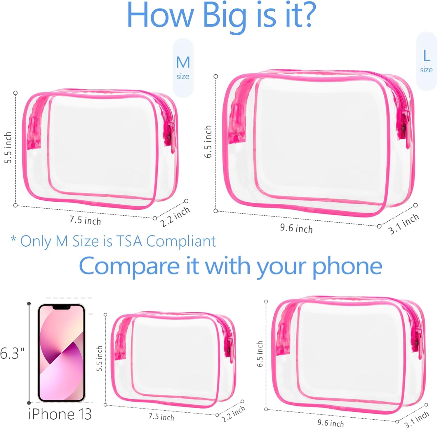 - TSA Approved, Meet Liquids Rule: The medium size clear makeup bag is 7.5 x 2.2 x 5.5 inch, it follows the TSA's 3-1-1 Liquid Rule published by TSA. You can quickly pass the airport security screening. Note: the large size clear bag is 9.6 x 3.1 x 6.5 inch, it is larger than one quart and is not TSA approved