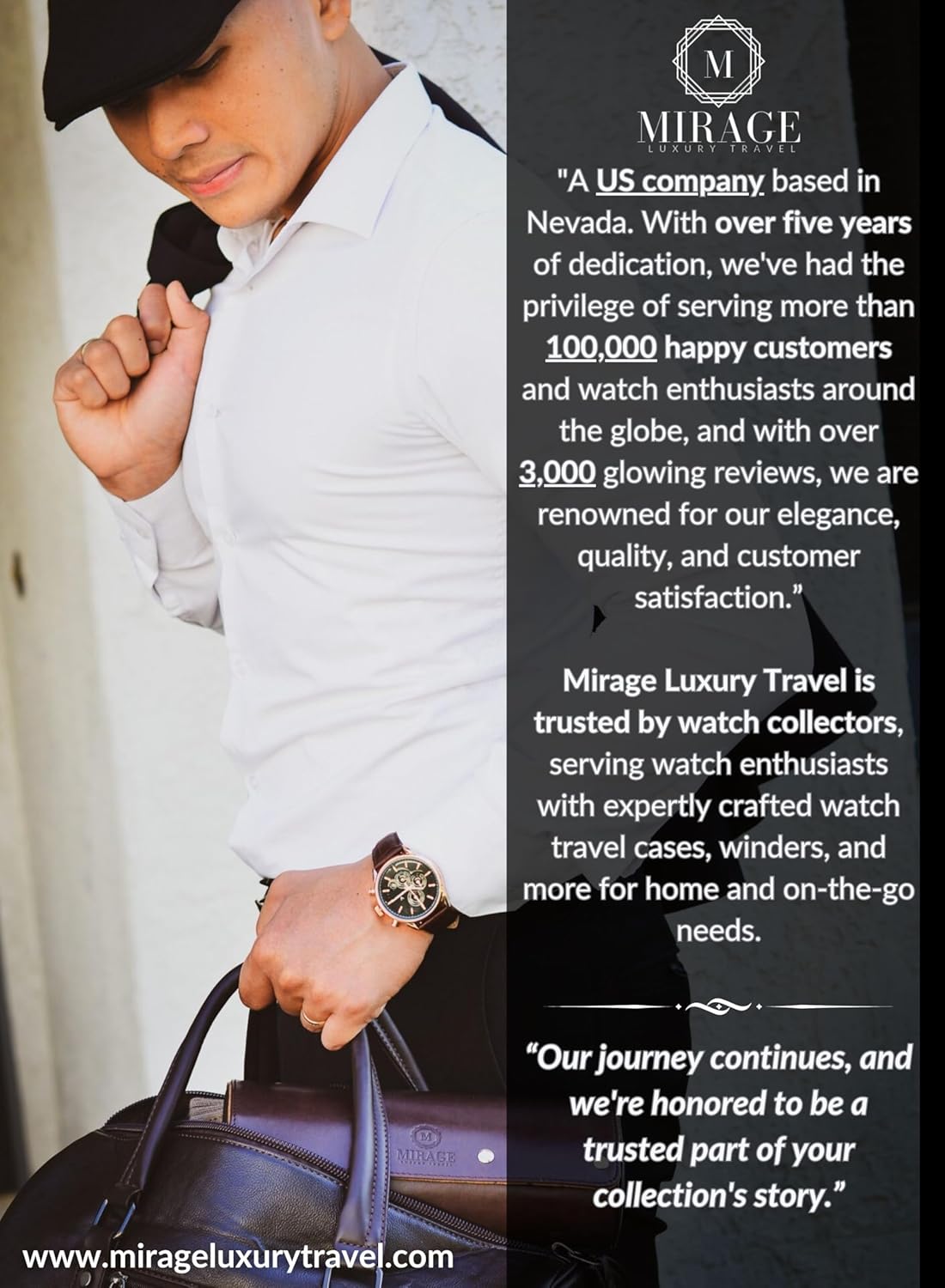 - 🎁 UNFORGETTABLE GIFT FOR WATCH LOVERS – Treat yourself or make someone smile with our elegant watch cases for men. The Mirage collection offers a perfect selection for all your watch accessory needs, whether for display or travel. Check out our storefront, explore our range of luxury travel products, and find the perfect gift to make every day memorable. 30-DAY MONEY BACK GUARANTEE, there is nothing to worry about. 😊