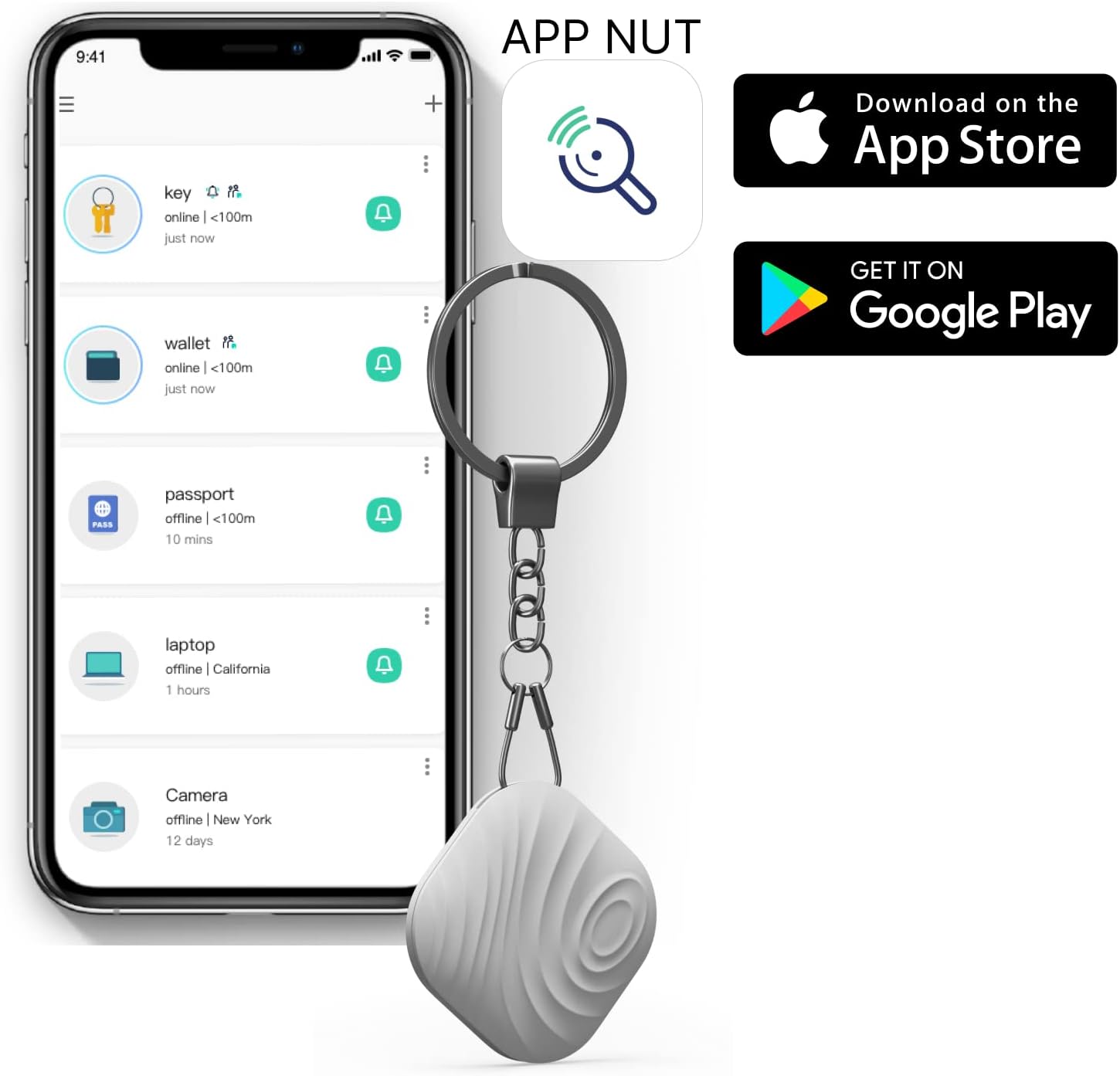 - ►【Key Finder with App】The key finder is connected to the phone via Bluetooth and Nut App. Size: 1.5 x 1.5 x 0.28 inches. It supports for iOS and Android phone. With 1 Nutale finder to attach keys, wallet, remote, glasses, phones, dog collars or other things that are easy lost. The key finder locator will help you not waste time searching for stuff.