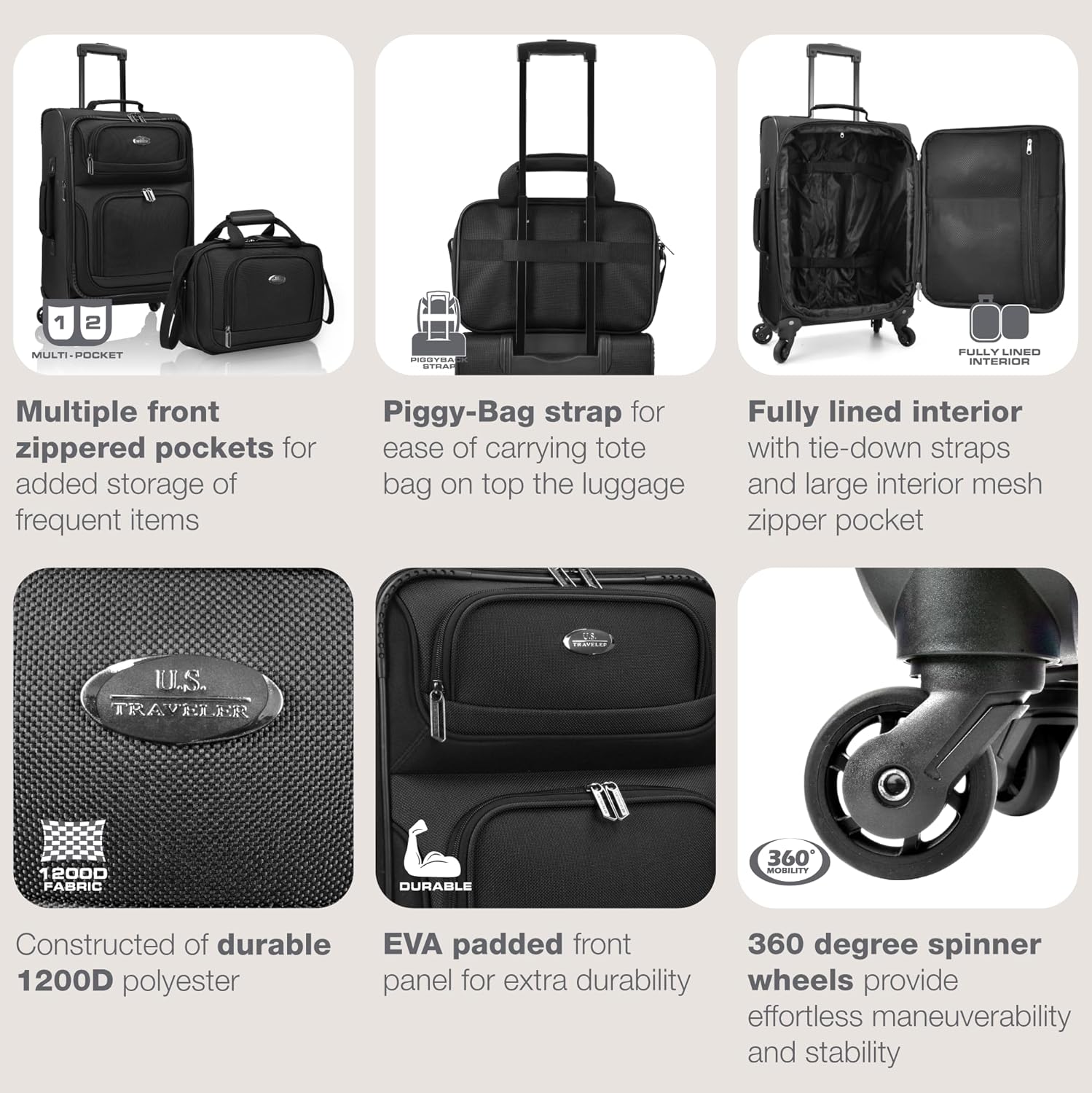 U.S. Traveler Lightweight Rolling 20" Carry On Luggage Softside Suitcase, Black, 4 Wheel