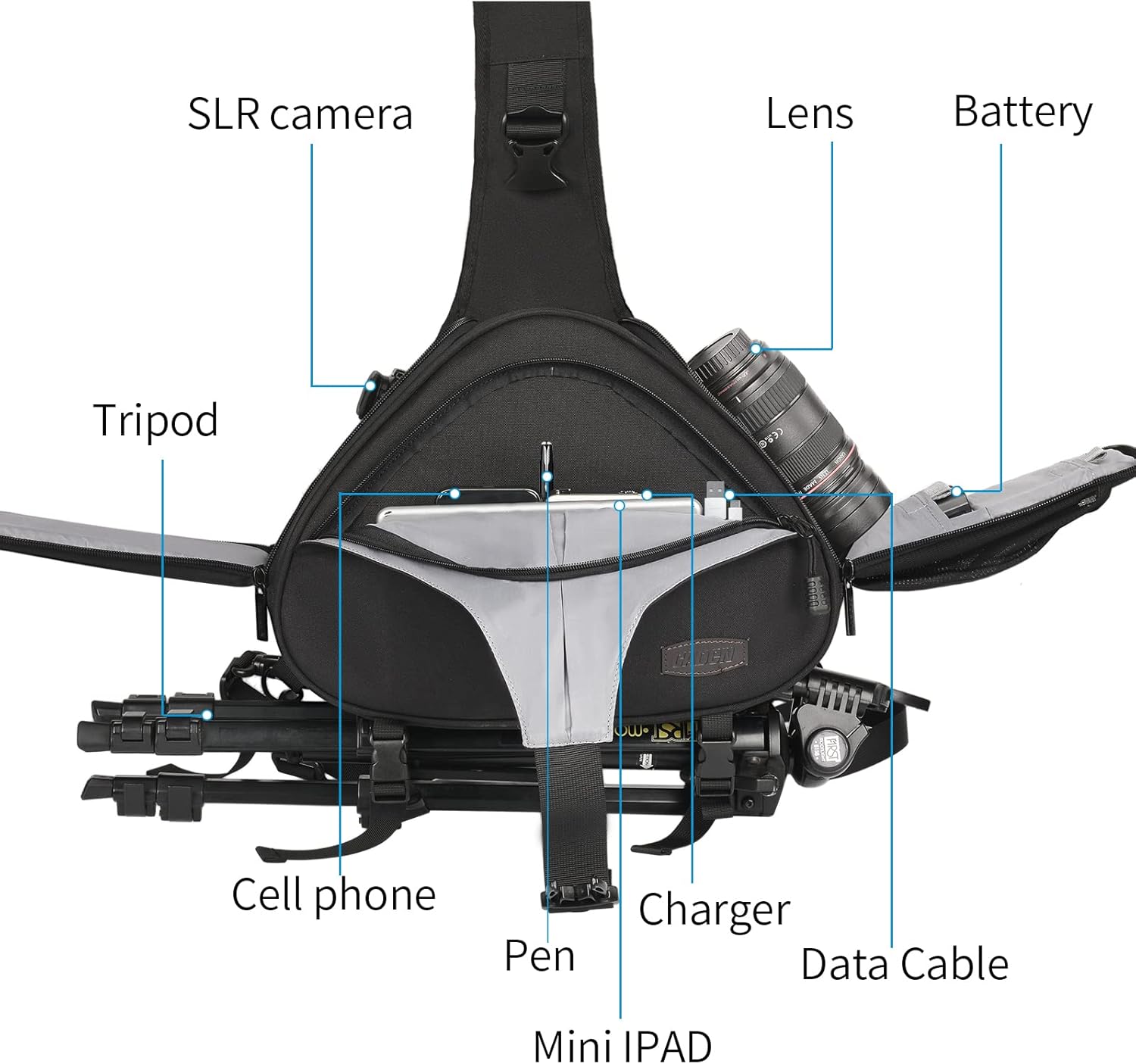 - 【Upgrade Larger Capacity】This upgraded K1 camera case is enlarged in size: 14*5.5*10.5 in. Fits 1 camera + 2 lenses + tripod + 8in iPad + other accessories, provided rain cover. Double protection for your camera gear and photography accessories. The front of the messenger camera bag has a large zippered bag big enough to hold an iPad mini, cell phone etc... Safe and practical.