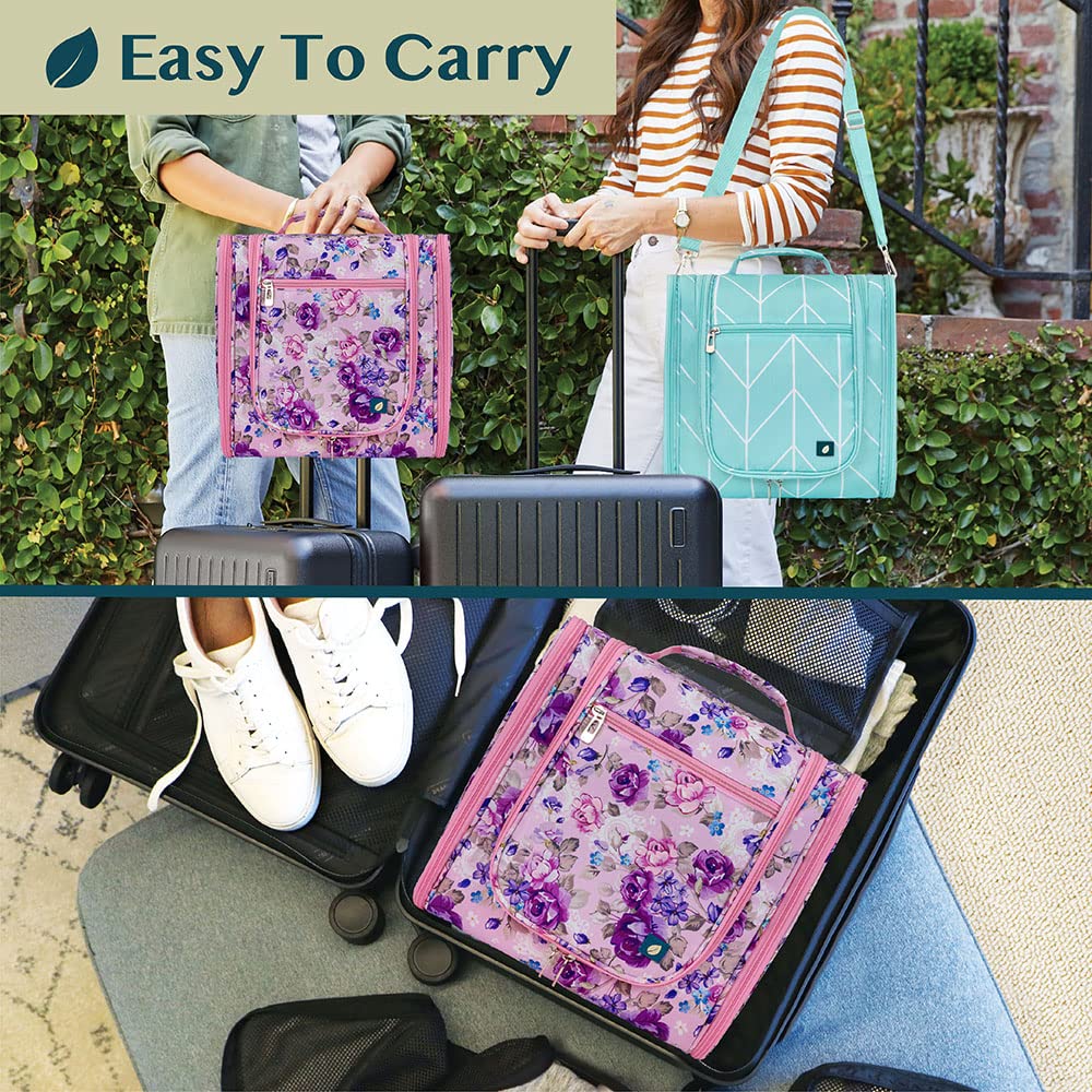 - COSMETICS TRAVEL BAG ORGANIZER: This toiletry bag for women has a hanging hook and multiple pockets that help you stay organizer during business trip, vacation travel. The hanging hook makes it easy to hang the toiletry bag to bars in the hotel shower bathroom. Unzip your toiletry bag to reveal compartments to organize your shampoo, skincare face hygiene products. This toiletry travel bag is an essential accessory for cruise in Europe, plane, Hawaii Trip, and honeymoon.