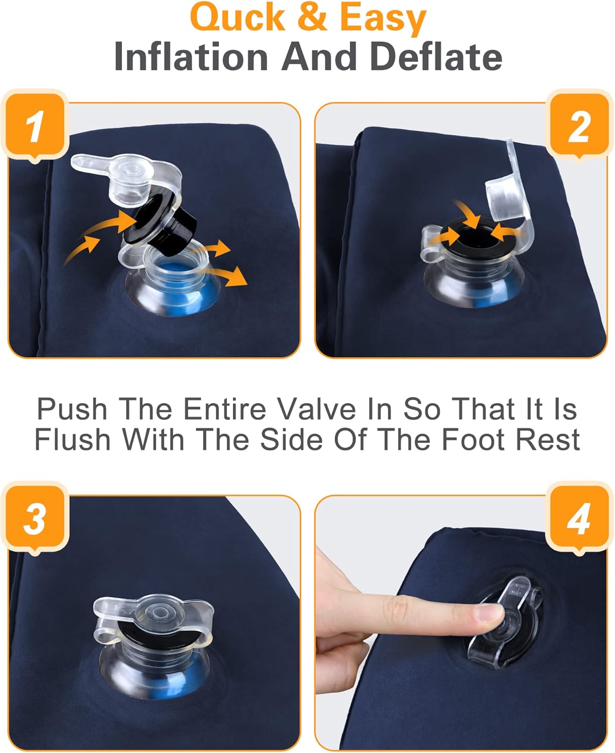 - Very User-Friendly Design: Our inflatable foot rest pillow with 2-in-1 double valve,the upper black air valve is a one-way air inlet for inflating or replenishing gas.bottom transparent air valve can be quickly inflated and deflated,when you are done blowing it up, push clear cover on and push whole valve in so that it is flush with the side of the travel foot pillow,the airplane footrest takes away the hassle of bringing a pump and making noise in flight.