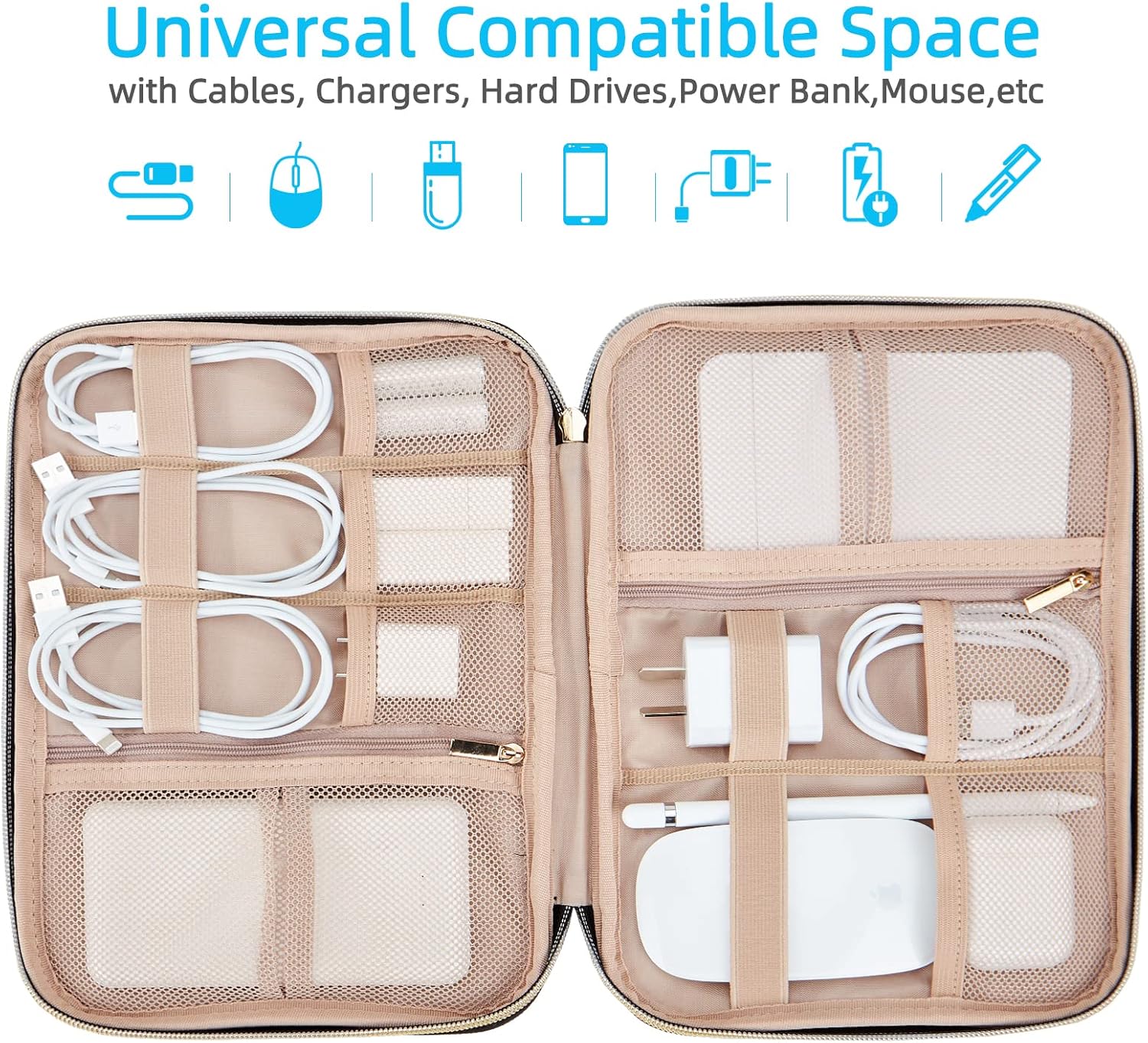 - LARGE CAPACITY-10.5×7.5×1.5inches(L×W×H); Spacious room for 4 cables, 1 mouse, 2 power bank(or potable hard drives, cables), 2 SD cards, 3 batteries, 2 USB drives and 1 charger