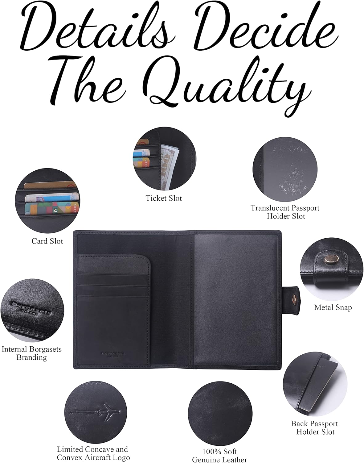 • ✅ FUNCTIONALITY – Borgasets Passport Wallet fits credit cards , cash , air tickets, passport . We produced Leather Passport Holder Keeper for men and women with pockets for credit , ID cards , money pocket . Your passport is secured with the snap button and won’t ever fall out