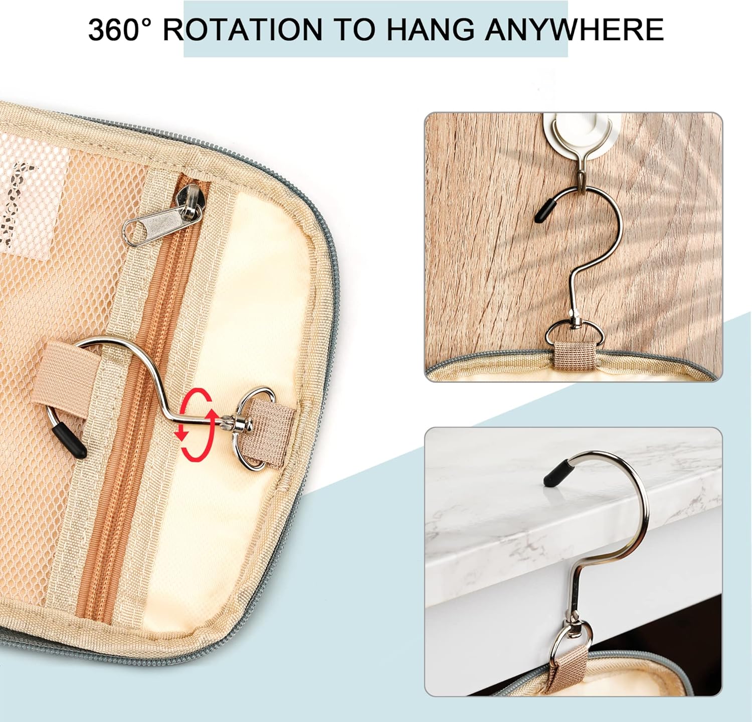 - CONSIDERABLE DESIGN - The elastic band and elastic mesh bag in the main compartment and two side compartments can keep the bottle fixed and upright. It has two waterproof compartments specially used for storing wet items. You can put your wet towel, toothbrush, shaving kit, and leaky cosmetics in it. The 360 degrees rotate metal hook gives you a variety of hanging options.