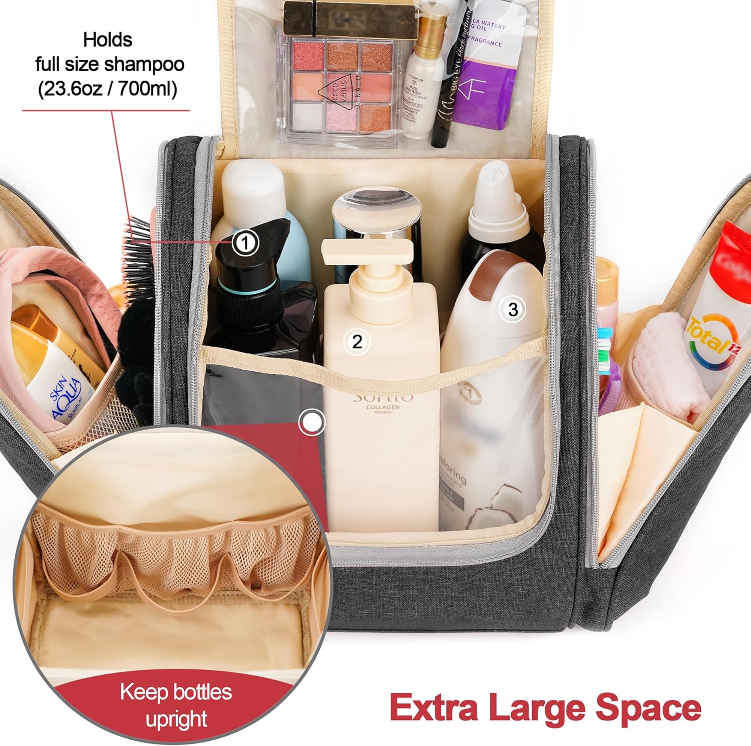 - GREAT ORGANIZER MASTER – This toiletry bag is designed with 6 storage compartments. You can categorize all your toiletries and put them into different pockets to make your journey orderly. Full load state size: 13.6 " L x 6.5" W x 11.8 " H, Empty state size:11" L x 6.5" W x 11.8" H. its main compartment can accommodate full-size toiletries and cosmetics (23.6oz / 700ml), travel essentials.