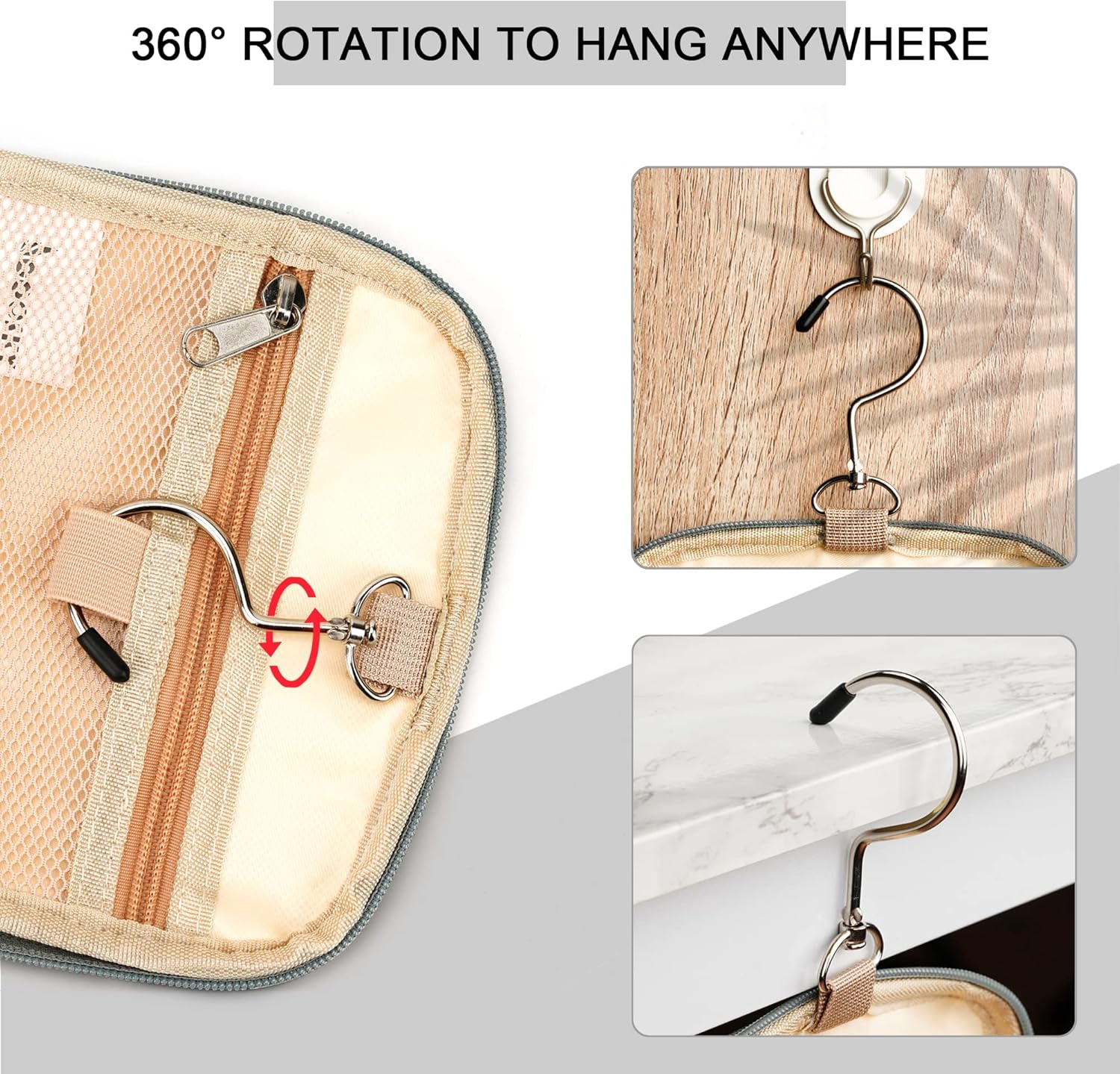 - CONSIDERABLE DESIGN - The elastic band and elastic mesh bag in the main compartment and two side compartments can keep the bottle fixed and upright. It has two waterproof compartments specially used for storing wet items. You can put your wet towel, toothbrush, shaving kit, and leaky cosmetics in it. The 360 degrees rotate metal hook gives you a variety of hanging options.