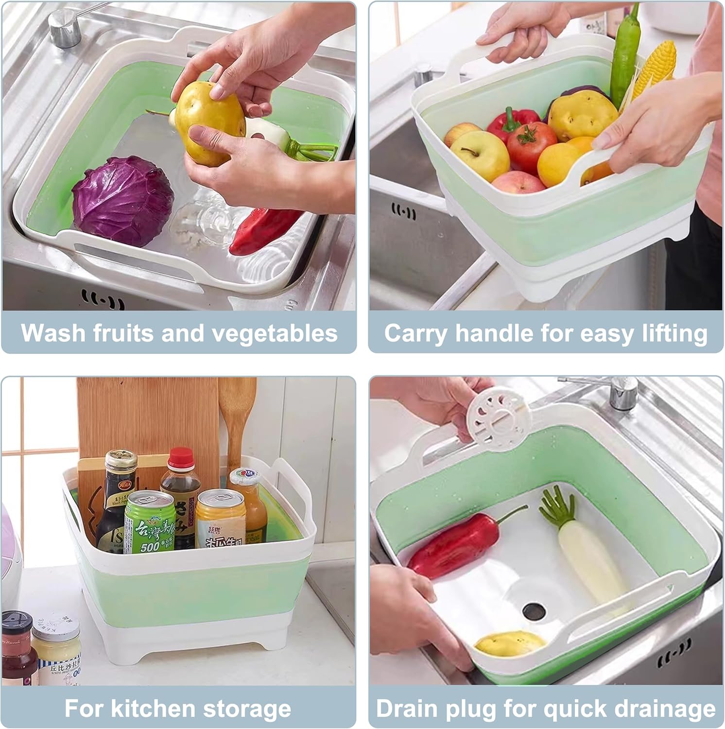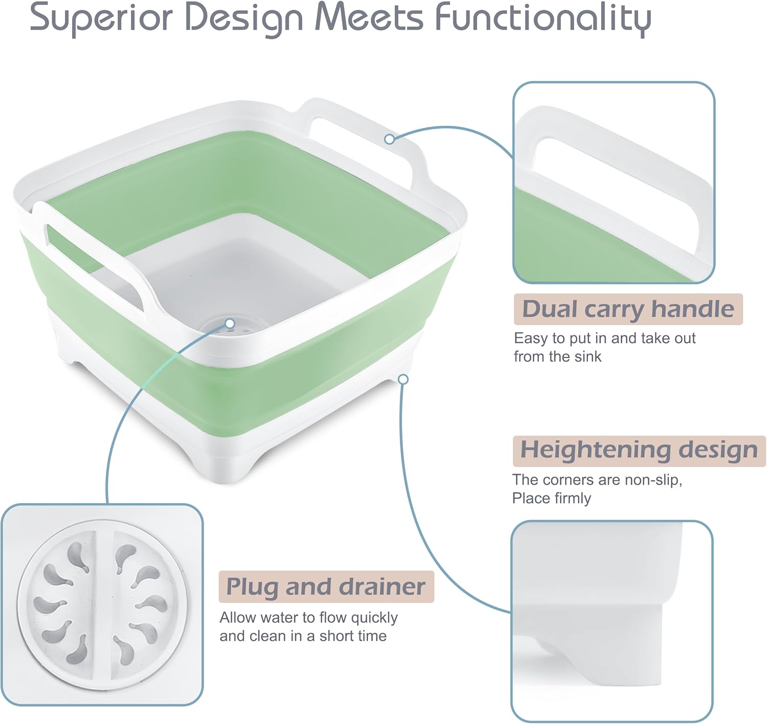 2.4 Gal(9L) Collapsible Dish Basin with Drain Plug - Multiuse Foldable Wash Basin for Baby Bottles, Space-Saving Multiuse Dish Tub, Kitchen Sink for Camping, Dishes Washing, RV (Green)