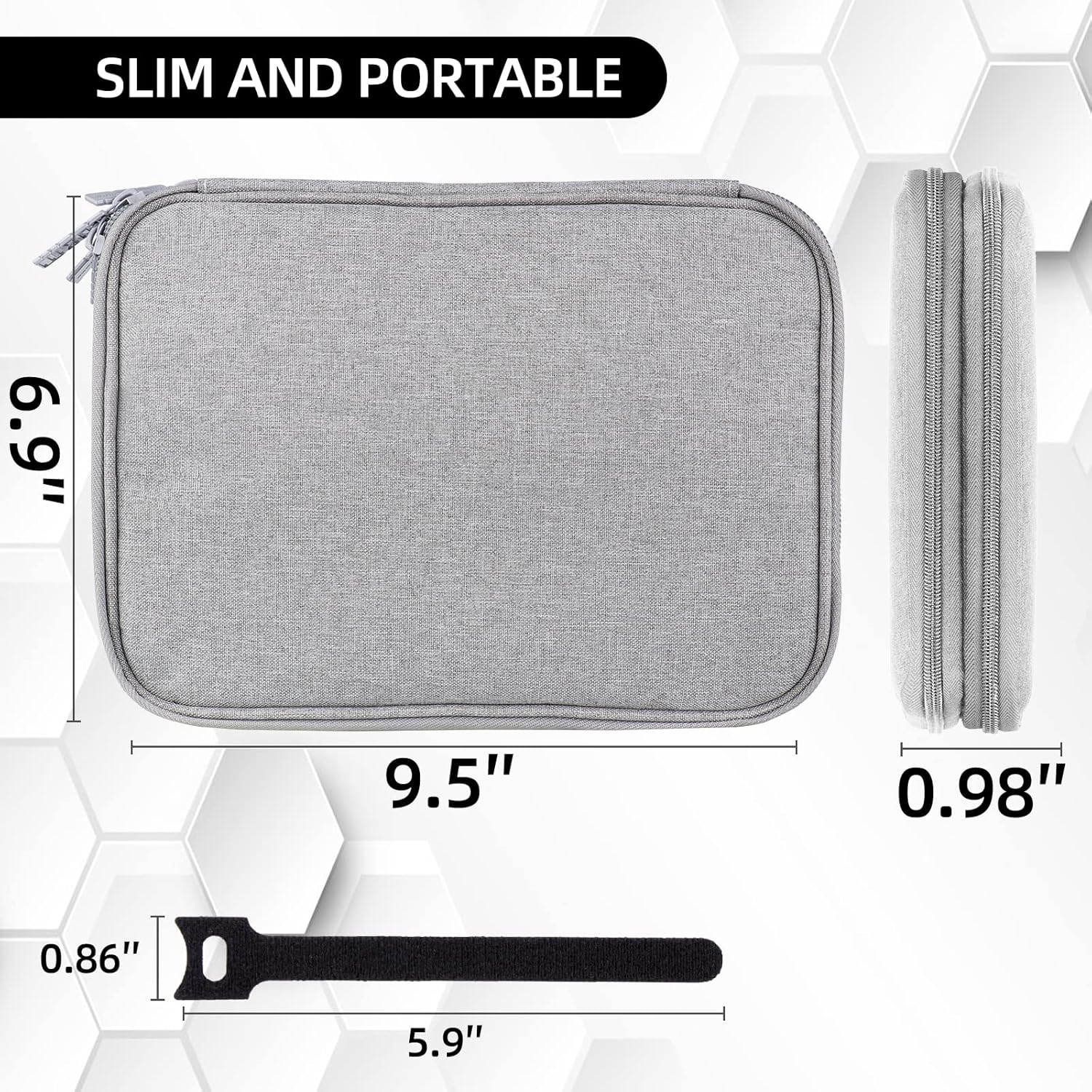 - LARGE CAPACITY & ACCESSORIES - The tech organizer travel case is 9.8 x 6.9 x 1 inches, with an internal flat measurement of 9.3 x 6.3 inches, and weighs 6.6 oz. Includes 5 REUSABLE CABLE TIES to keep your travel case tidy (Cords and accessories not included)