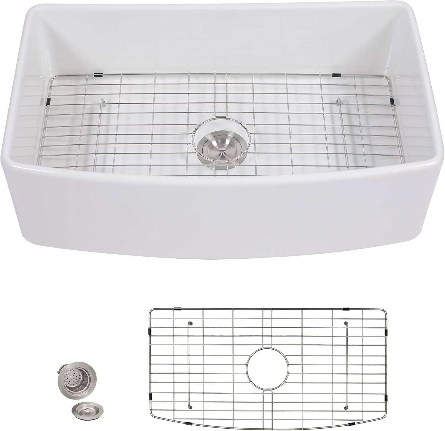 - 33" apron farm sink features a curved front design. Apron flat installation style fits most kitchen decor styles. Sleek curved shape, smooth lines and pure white color palette give the ceramic apron sink an elegant and classic look, which is the perfect indispensable addition to your modern kitchen.