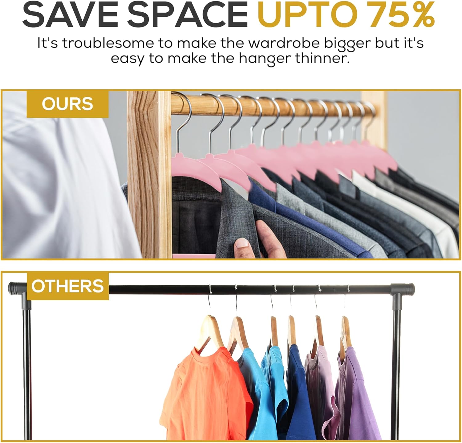 - MAXIMIZE CLOSET SPACE : Transform your closet with these space saving thin & slim hangers. Their ultra thin design 1/4” width allows for maximum storage space, giving you 50% more space in your wardrobe. Each hanger measures 17.7"L x 9"H and features a 360 degree swivel galvanized metal hook for easy sorting and hanging.