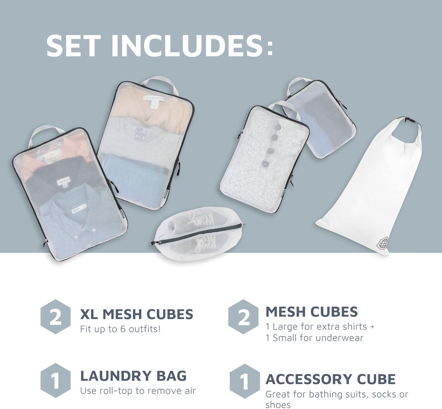 - LUGGAGE ORGANIZER- See through mesh makes organization easy. Keep different outfits in separate compression cubes and always be ready for what’s next! Easily pack away clothing like raincoats/heavier jackets that are not used as often.