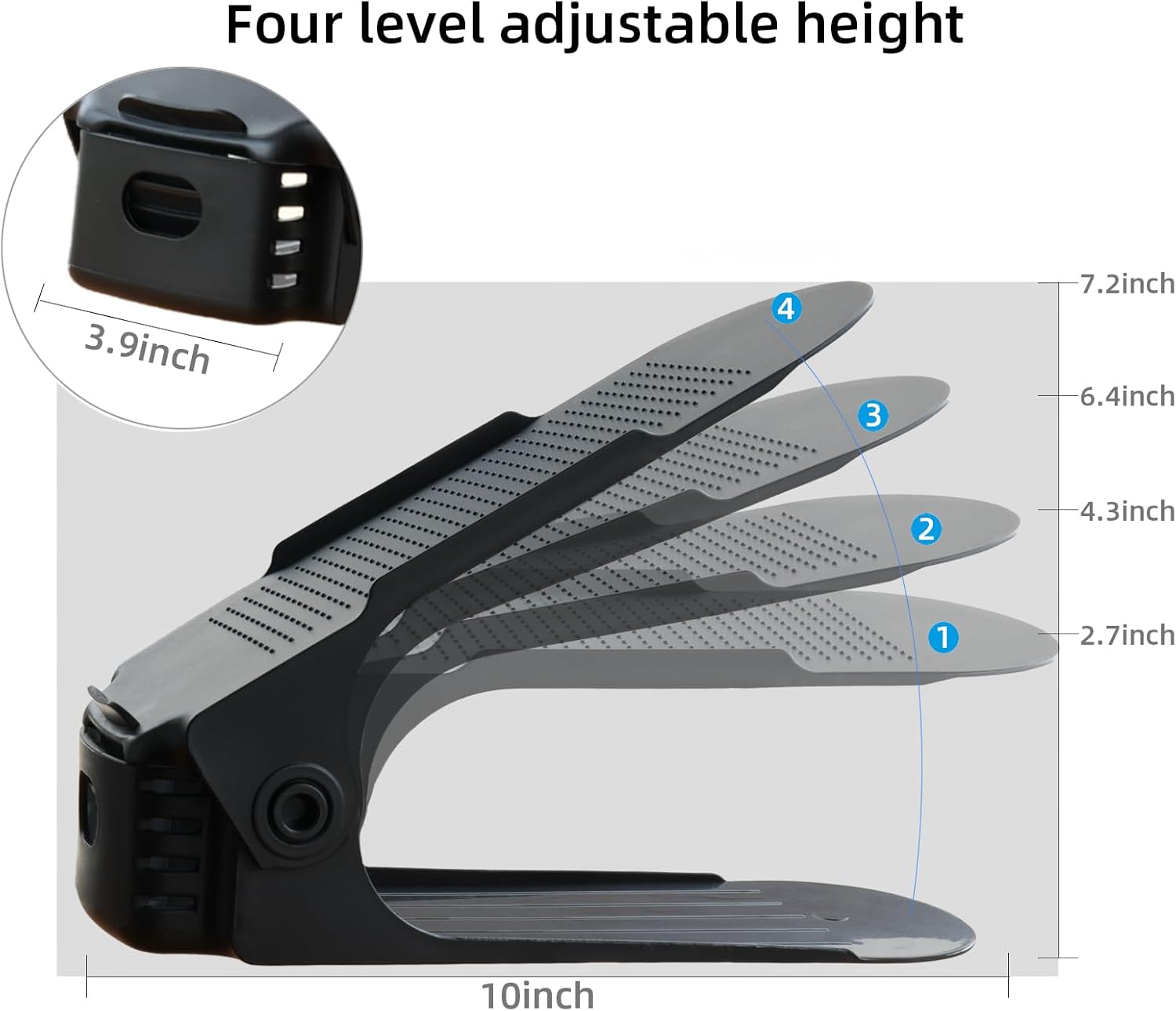 - Four-POSITION FLEXIBLE ADJUSTABLE - Adjustable heights from 2.7'', 4.3'', 6.4'' to 7.2'', perfect for all kinds of shoes, whether it's flat shoes or high heels (the size should bellow 9). With a fine size design, you don't have to worry about the shoes being squeezed