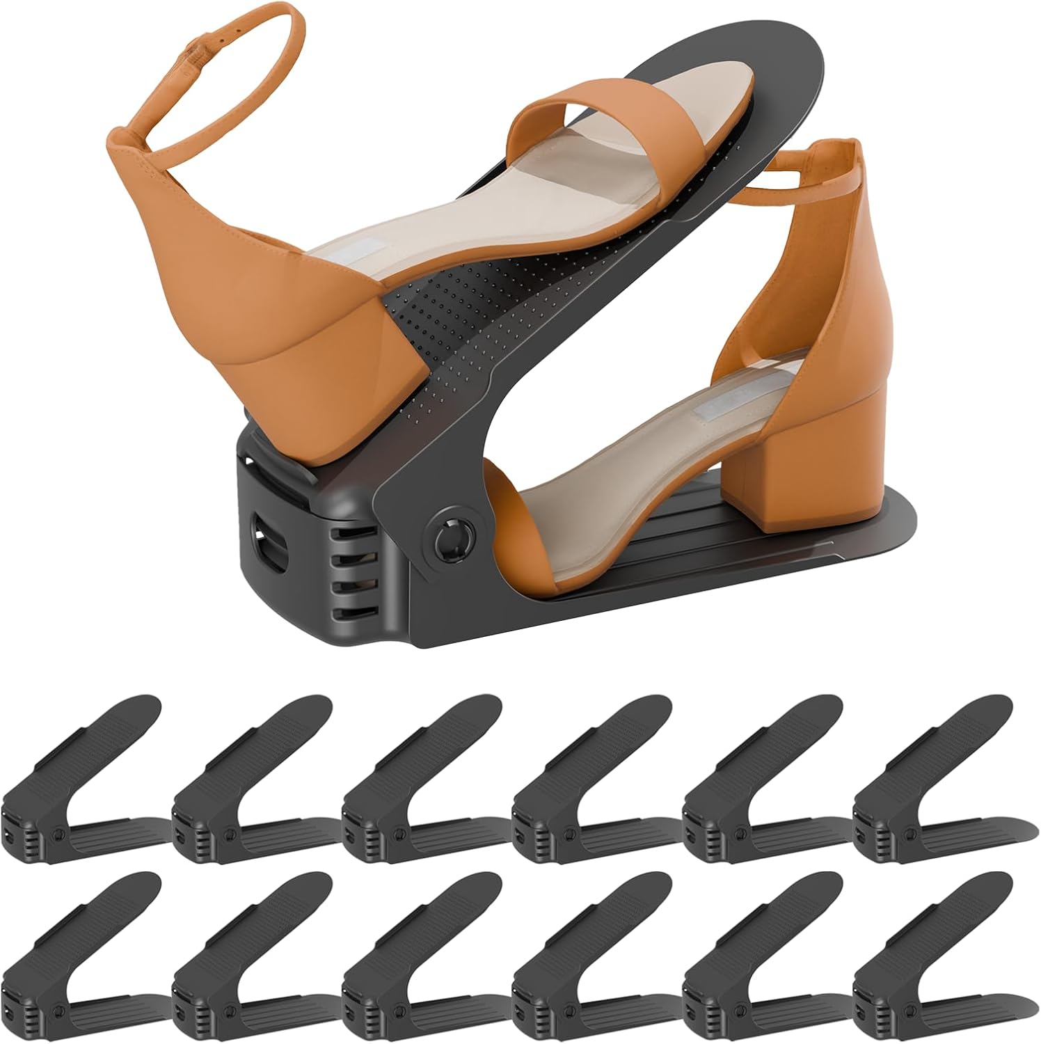 Shoe Slots Organizer, 12PCS Adjustable Double Layer Stack Shoe Rack, 50% Space-Saving Storage Rack Holder, Black