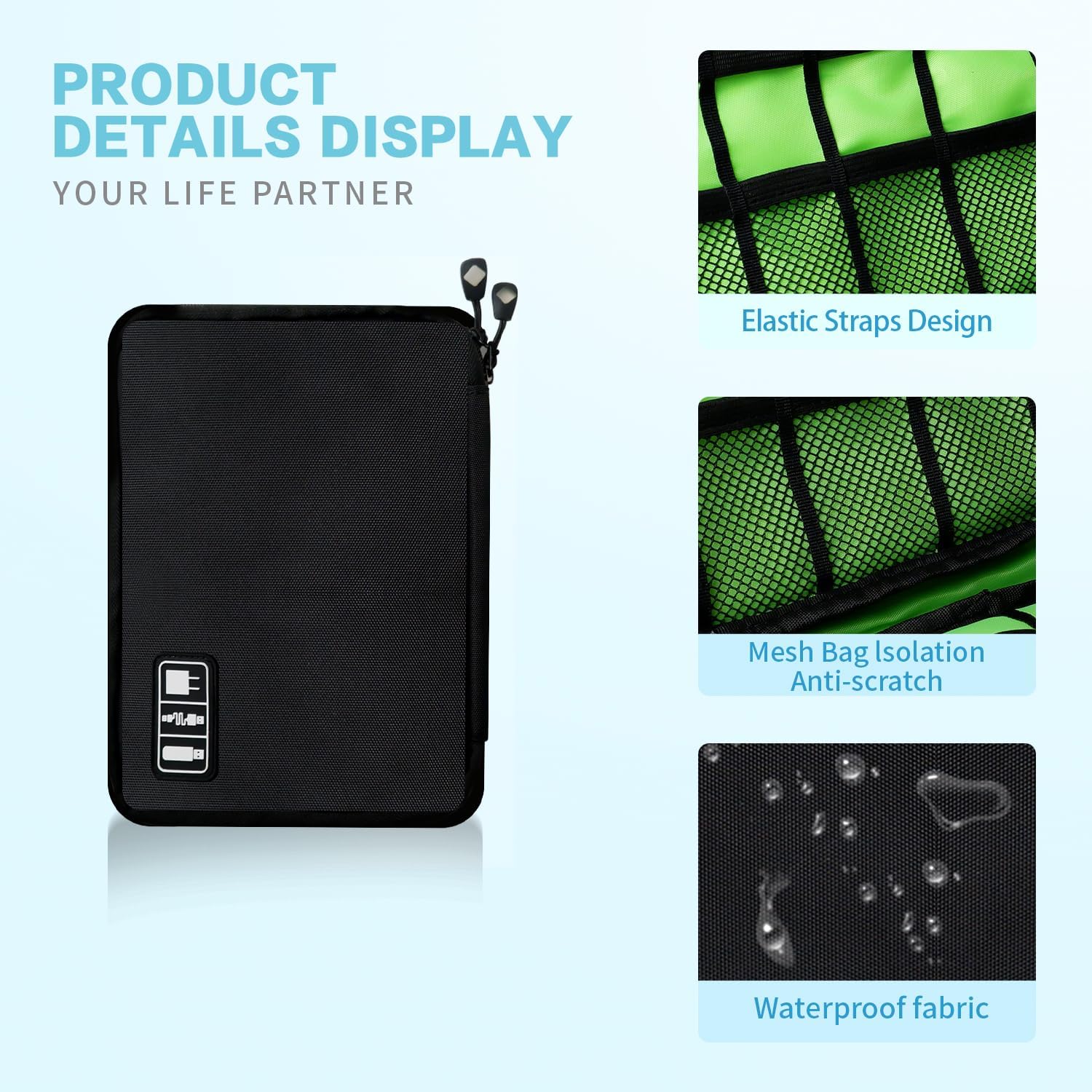 - Safe Storage:It has one mesh pocket with zipper, 6 elasticized mesh segments and multiple elastic loops,so you can store multiple sizes of cables.Classify and store your items to make them excellent travel cord organizer and travel cable organizer