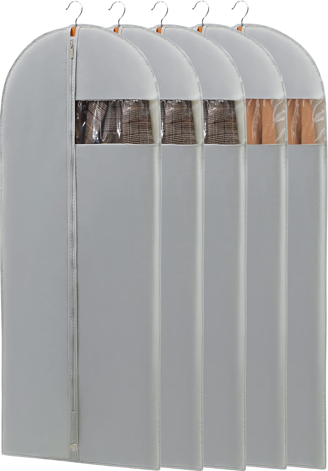 Dress Bags for Gowns, 65'' Long Garment Bags for Hanging Clothes, Dress Garment Bag, Grey Dress Cover with Clear Window for Dresses, Coats, Uniforms - 5 Pack