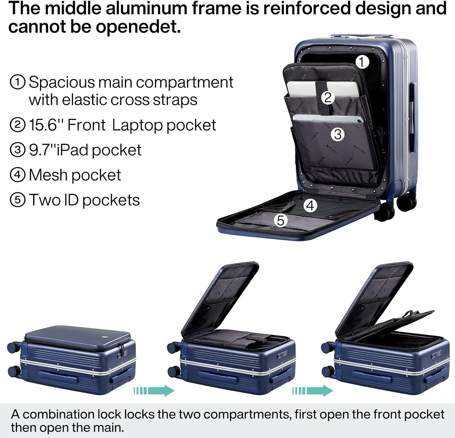 Hanke 20 Inch Carry On Luggage with Front Pocket Aluminum Frame, Hard Shell Suitcases with Wheels, Rolling Luggage, Suitcase with Lock, Travel Luggage for Weekender, Dark Blue