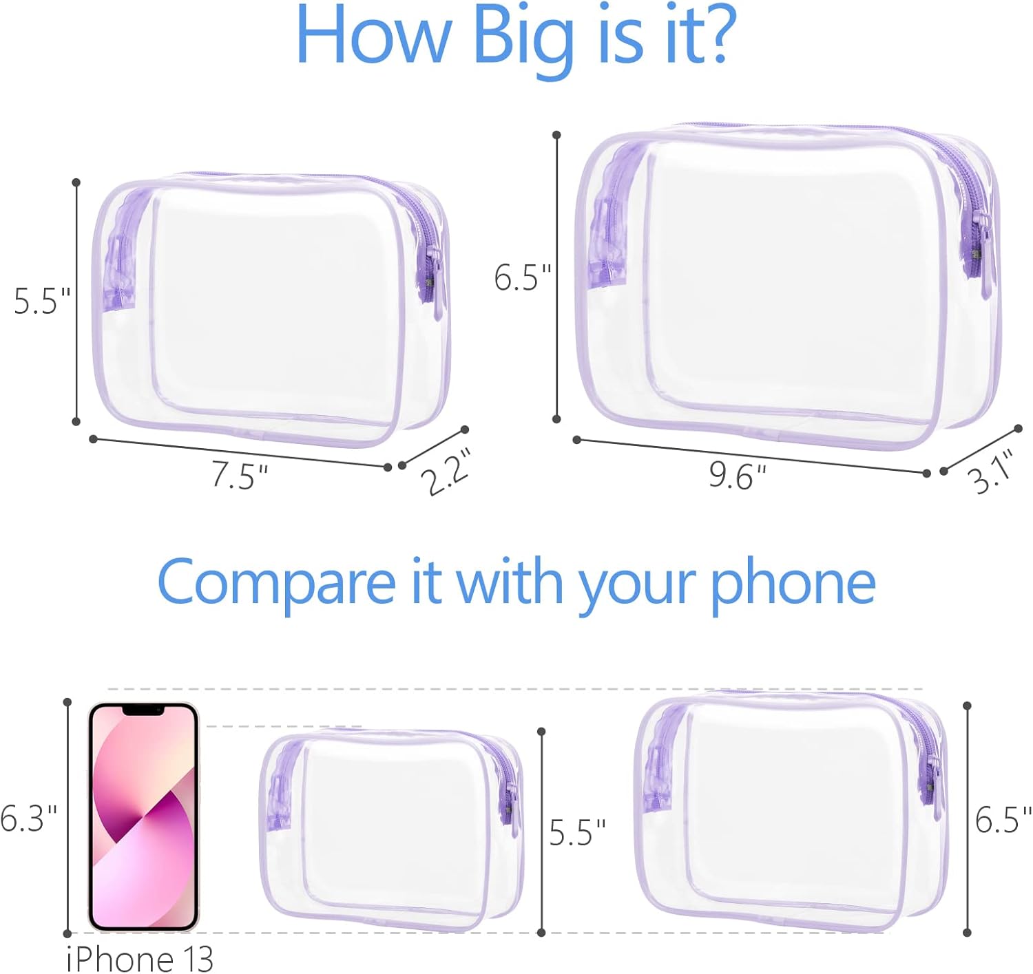 - High-Quality, Durable: The clear makeup bags keep the shape with reinforced boning. Smooth metal zipper for longevity, ensuring a secure seal that complies with TSA regulations for sealed bags. Wide opening for easy access. A net weight of only 0.7 lbs per bag, light and feelless