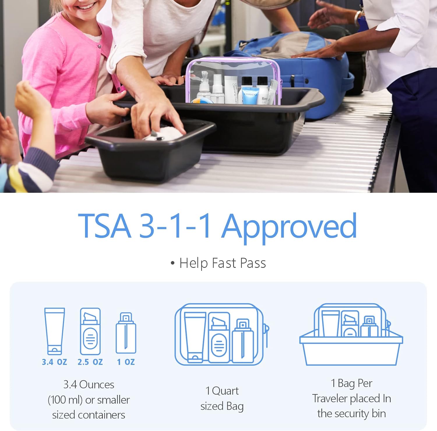 - TSA Approved, Meet Liquids Rule: The medium size clear makeup bag is 7.5 x 2.2 x 5.5 inch, it follows the TSA's 3-1-1 Liquid Rule published by TSA. You can quickly pass the airport security screening. Note: the large size clear bag is 9.6 x 3.1 x 6.5 inch, it is larger than one quart and is not TSA approved