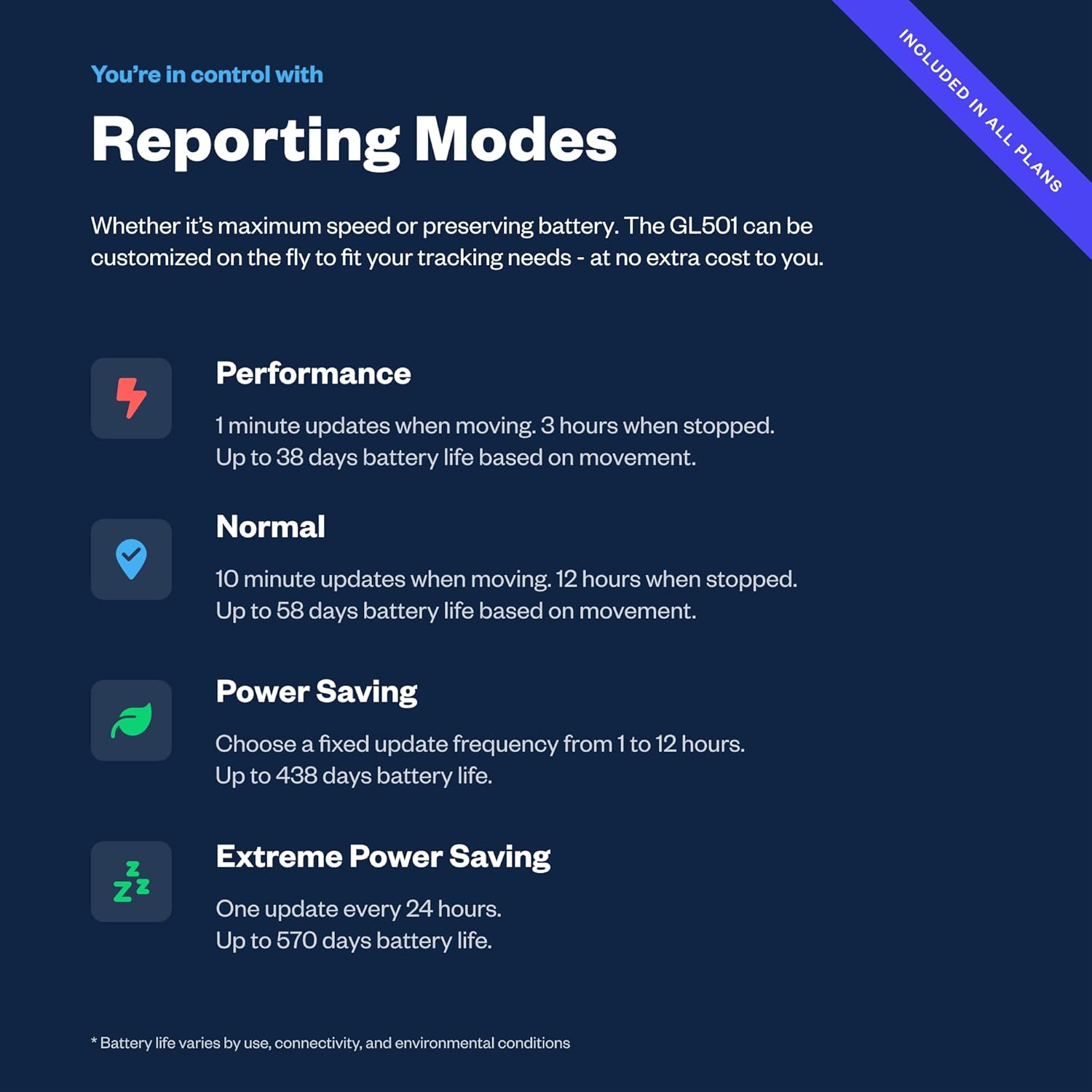- REPORTING MODES: customize the update frequency of your tracker to maximize battery life and report faster. Frequency Options: Extreme Power Saving = Once every 24 hours; Power Saving= choose from 1 hour to 12 hour intervals; Normal = 10 minutes moving, 12 hours stopped; Performance = 1 minute moving, 3 hours stopped.