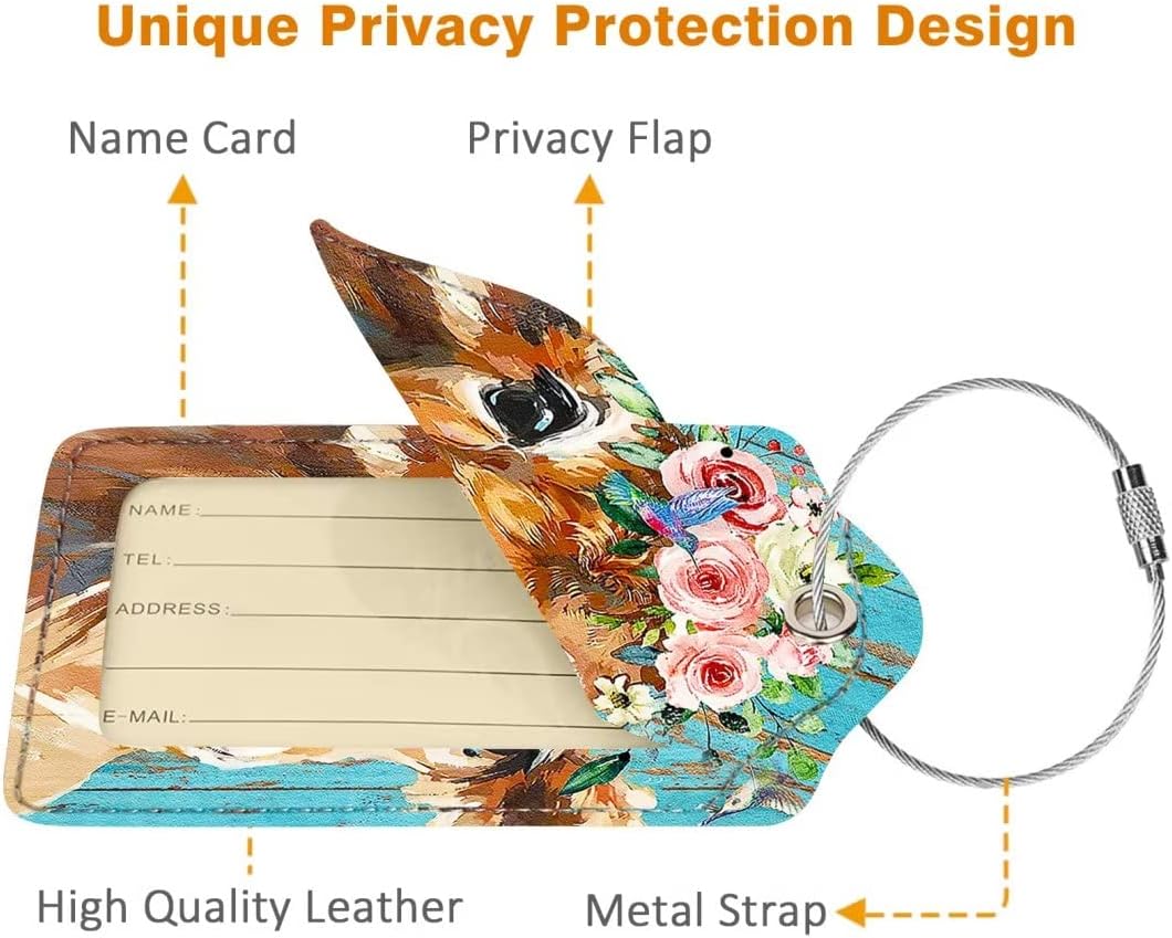 2 Pack Luggage Tag for Suitcase, Cute Unique Leather Bag Tags Identifiers Privacy Cover ID Label with Durable Steel Loop for Women Men Kids Girls Travel, Cattle