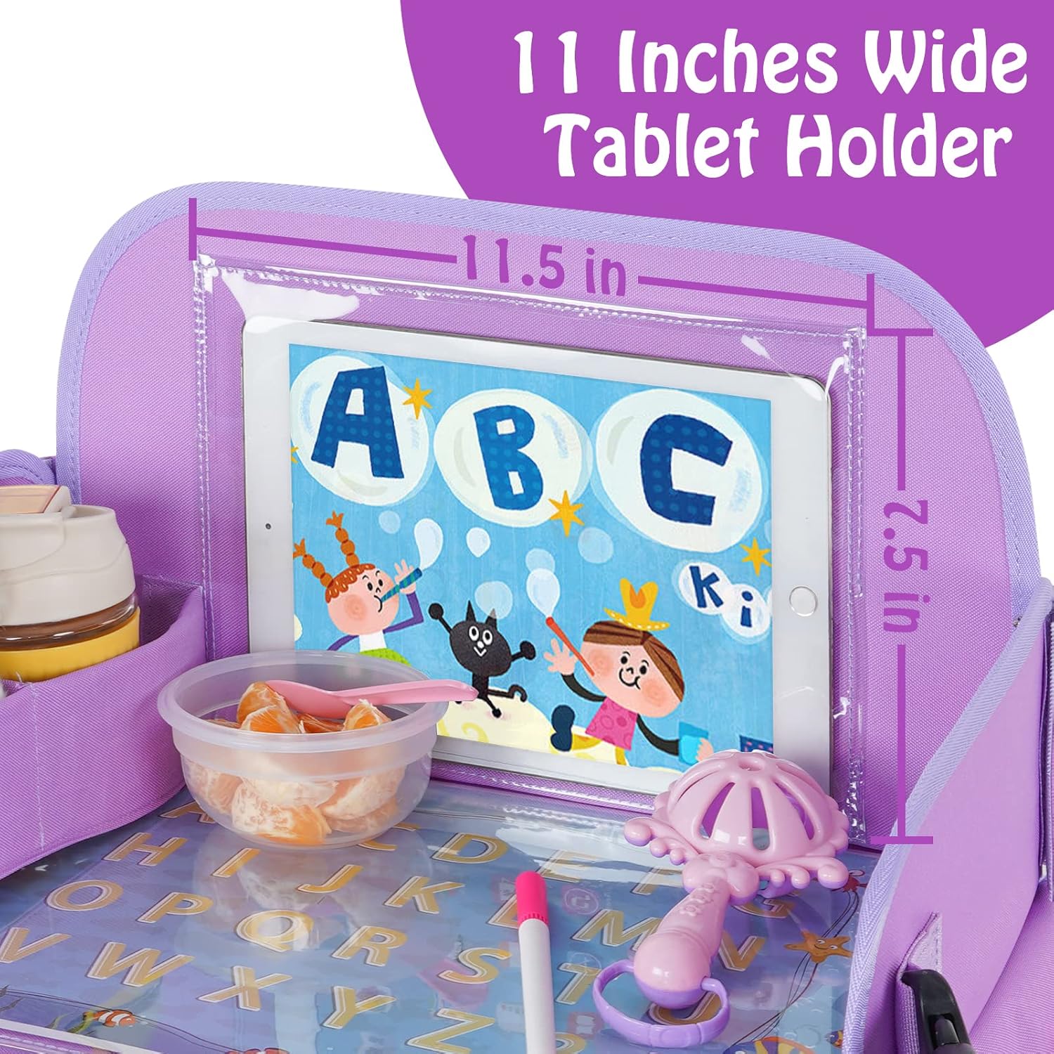 MENZOKE Car Seat Tray for Kids Travel, Kids Travel Tray with Educational Drawing Board, Tablet Holder & Cooler Cup Holder, Holiday Gifts for Car Trip, Purple