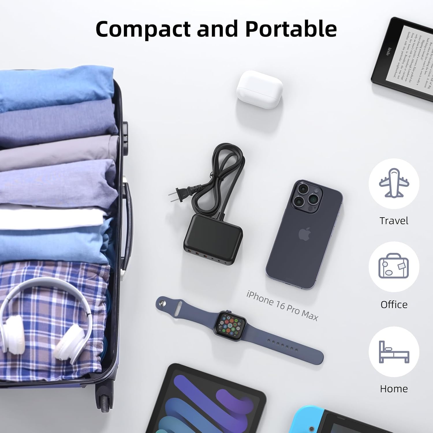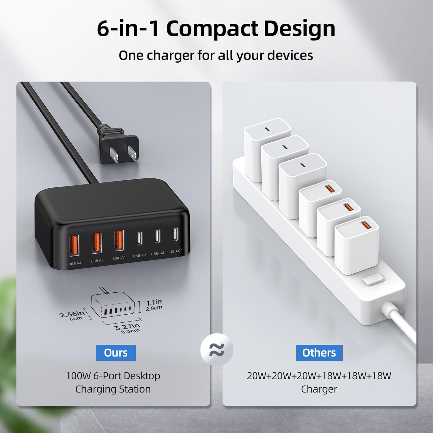 - âĄăSuper Fast ChargingăUSB C Charger Block with 3 USB-C Power Delivery port(each port 20W max) and 3 QC USB-A port(each port 18W max), total output power up to 100W. Equipped with a 5 ft extension cord, it is not restricted by distance and can be charged without restraint. 6 in 1 USB-C Charging Station can provide high-speed charging for iPhone, Samsung, ipad, watch, fan, portable charger and other 6 devices at the same time. Charge your iPhone 14 from 0% to 50% in just 30 minutes