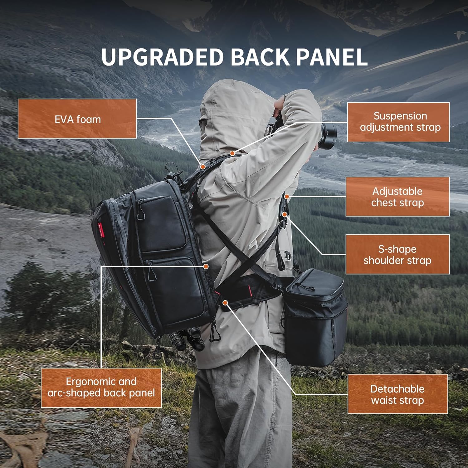 - 【Upgraded Back Panel System】Ergonomic arc-shaped back panel; EVA foam and scuba knit fabric; Adjustable sternum strap; Detachable waist strap; S-shape shoulder strap; Ventilation ridge& Stabilizer strap all bring enhanced comfort on the move