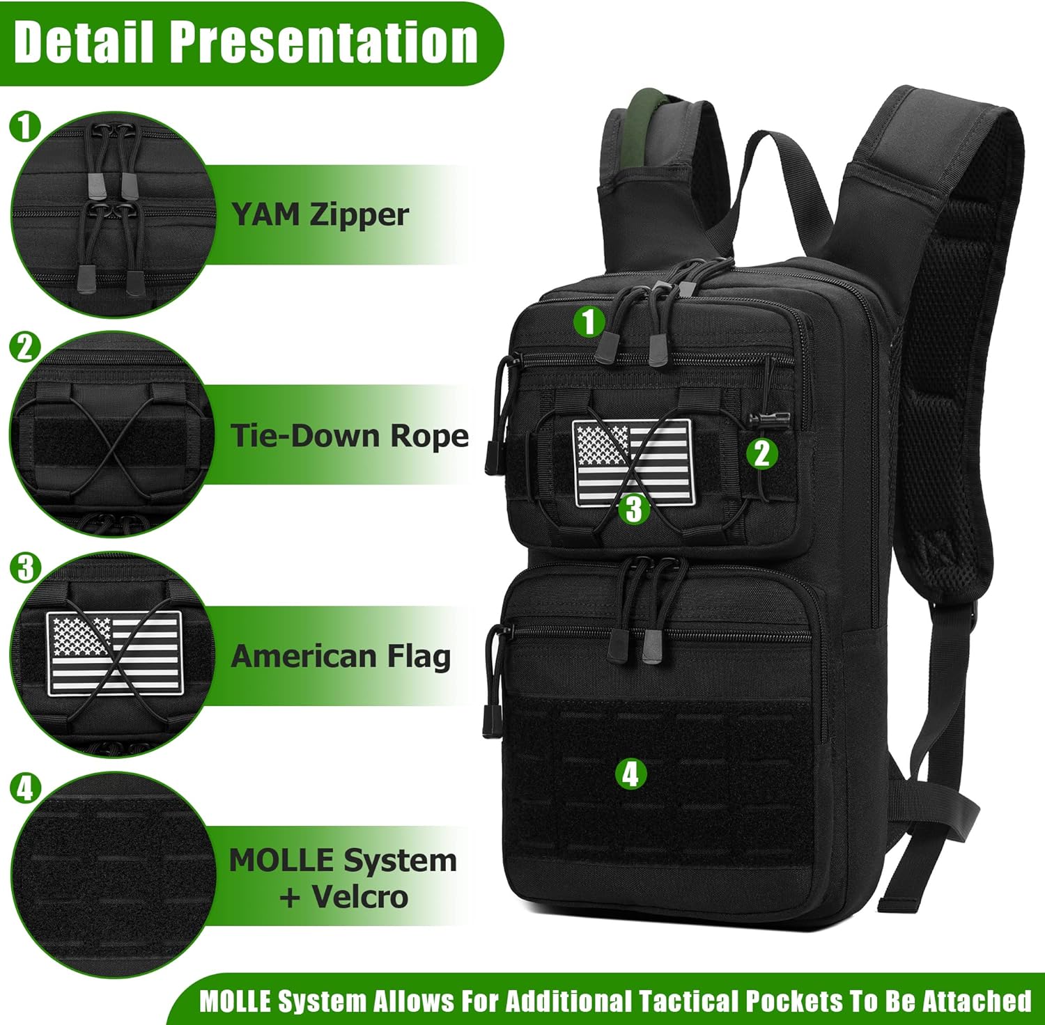 - High-quality Tactical Hydration Backpack: Made of 1050D Nylon, the double-row thread is more strong, and the seams are clean and neat, military-grade webbing sturdy, fade resistant, and the use of YKK double zippers, the quality exceeds most backpacks on the market