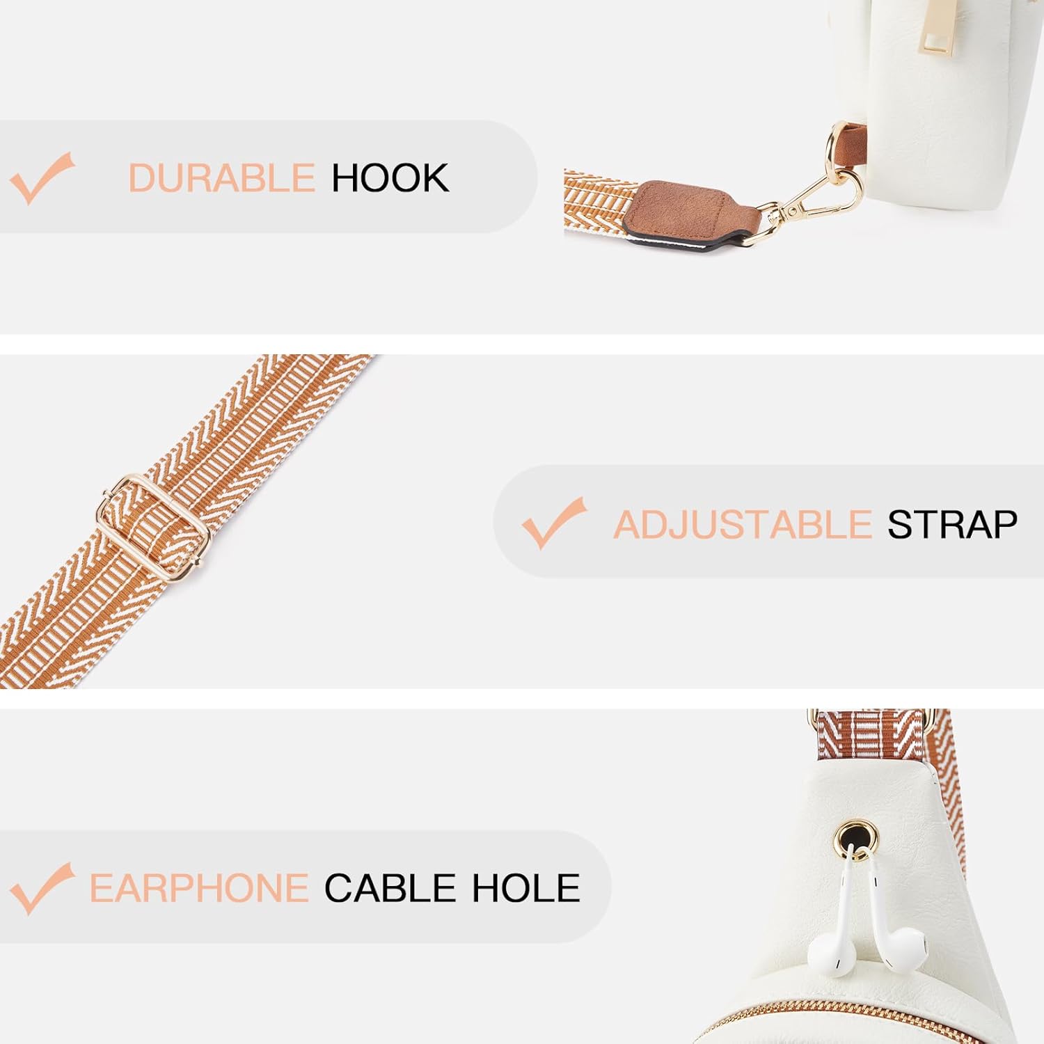 - High-Quality Material: Sling bag for women made with premium faux leather and designed with vintage embroidered shoulder straps, both functional and stylish. This fanny pack crossbody bags for women allows you to carry around all your essentials hands-free while matching any outfit and keeping a chic look. A small opening on the front holds your headphone cable or charging cable in place, so you can enjoy music or charge your phone easily