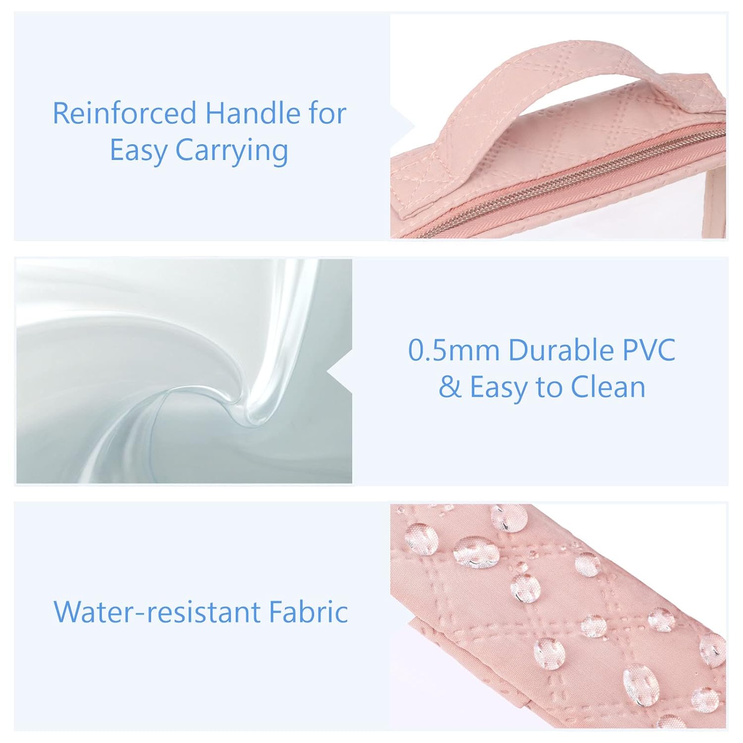 - High Quality: The transparent design on both sides is made of 0.5 PVC plastic, and the surrounding is made of splash-proof polyester fabric, which is sturdy and easy to clean. The reinforced seams prevent the bag from tearing easily. Each cosmetic bag is equipped with a high-quality metal zipper, durable and smooth