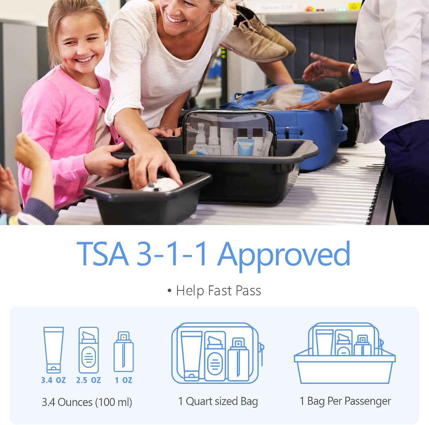 - TSA Approved, Meet Liquids Rule: The medium size clear makeup bag is 7.5 x 2.2 x 5.5 inch, it follows the TSA's 3-1-1 Liquid Rule published by TSA. You can quickly pass the airport security screening. Note: the large size clear bag is 9.6 x 3.1 x 6.5 inch, it is larger than one quart and is not TSA approved