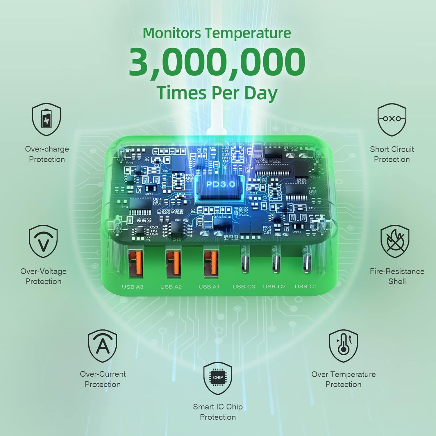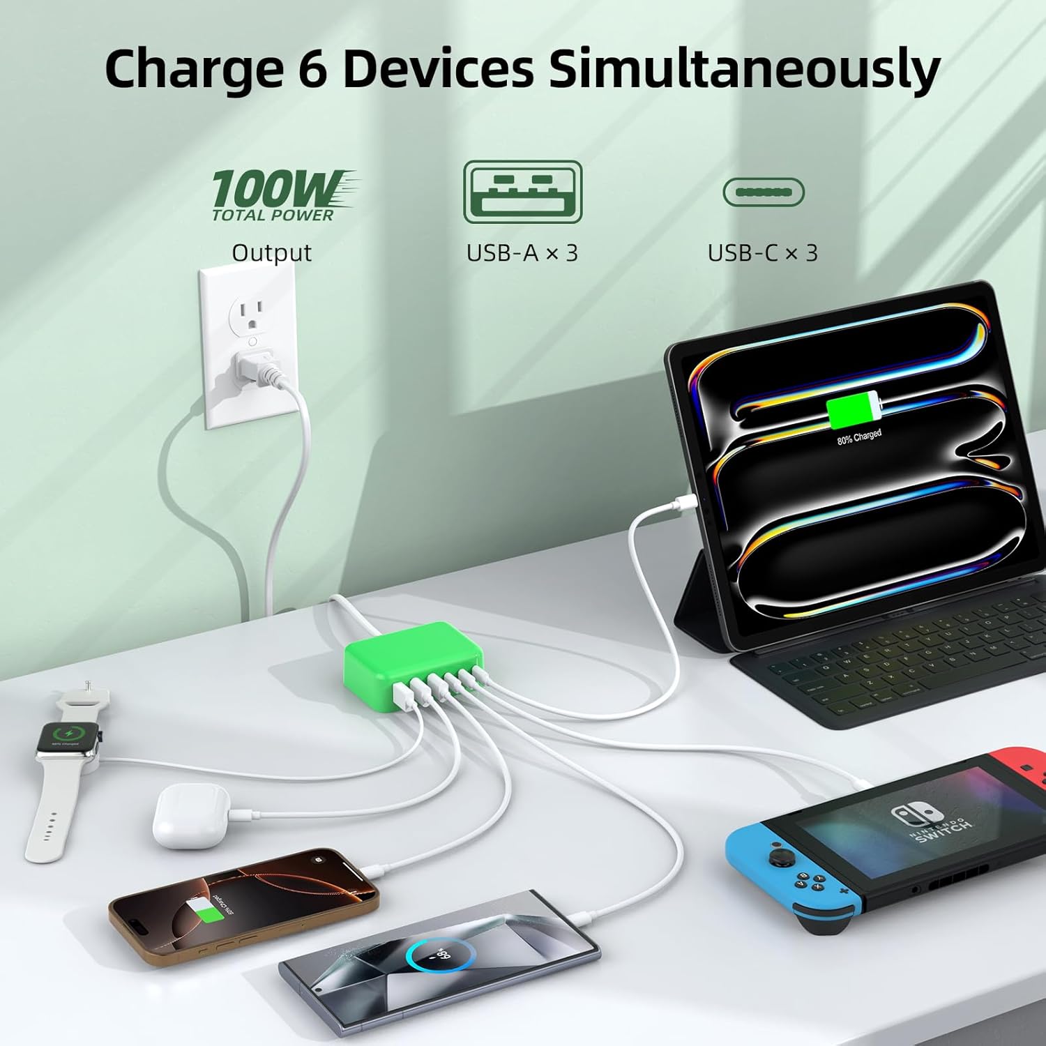 - âĄăSuper Fast ChargingăUSB C Charger Block with 3 USB-C Power Delivery port(each port 20W max) and 3 QC USB-A port(each port 18W max), total output power up to 100W. Equipped with a 5 ft extension cord, it is not restricted by distance and can be charged without restraint. 6 in 1 USB-C Charging Station can provide high-speed charging for iPhone, Samsung, ipad, watch, fan, portable charger and other 6 devices at the same time. Charge your iPhone 14 from 0% to 50% in just 30 minutes