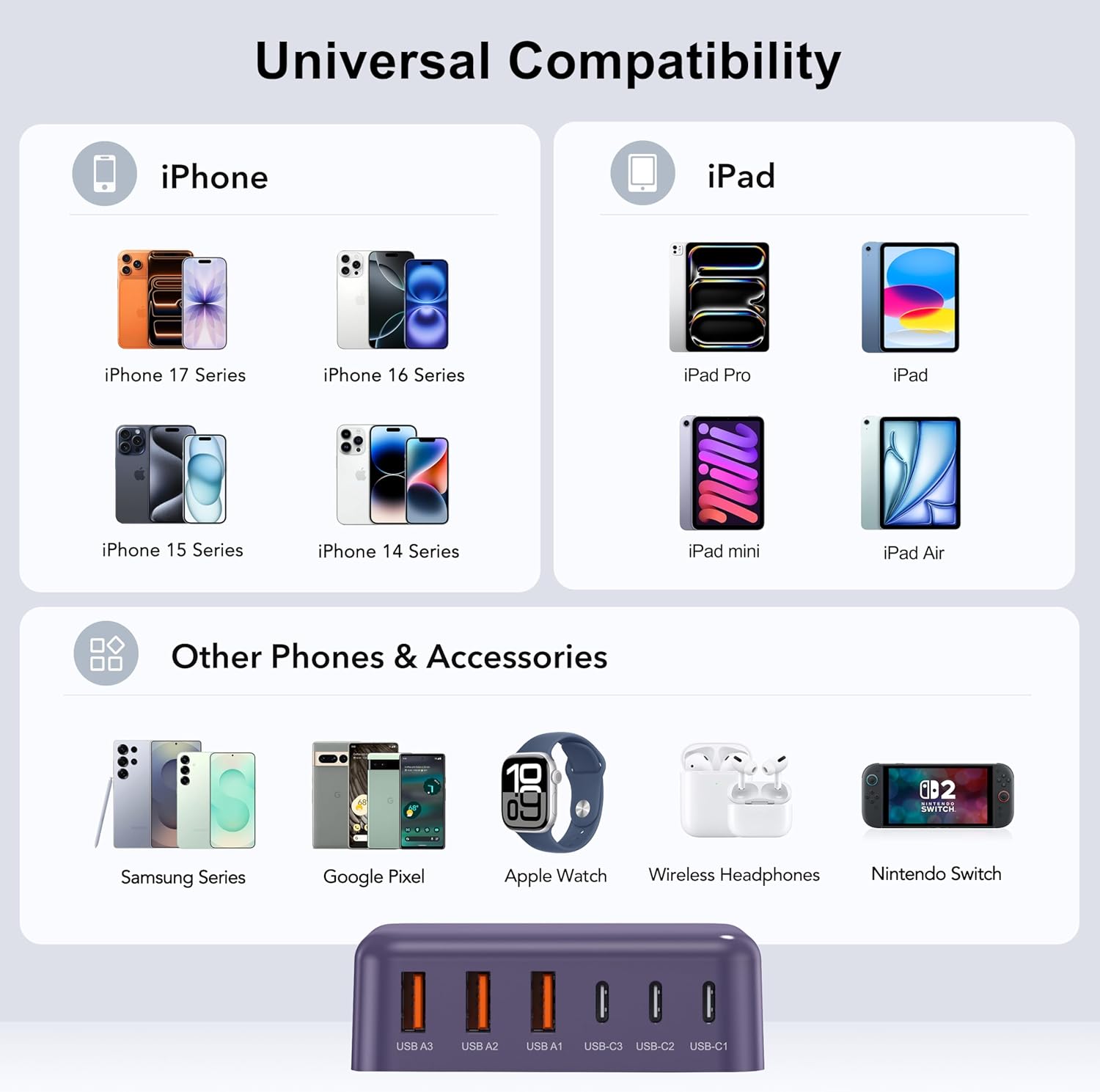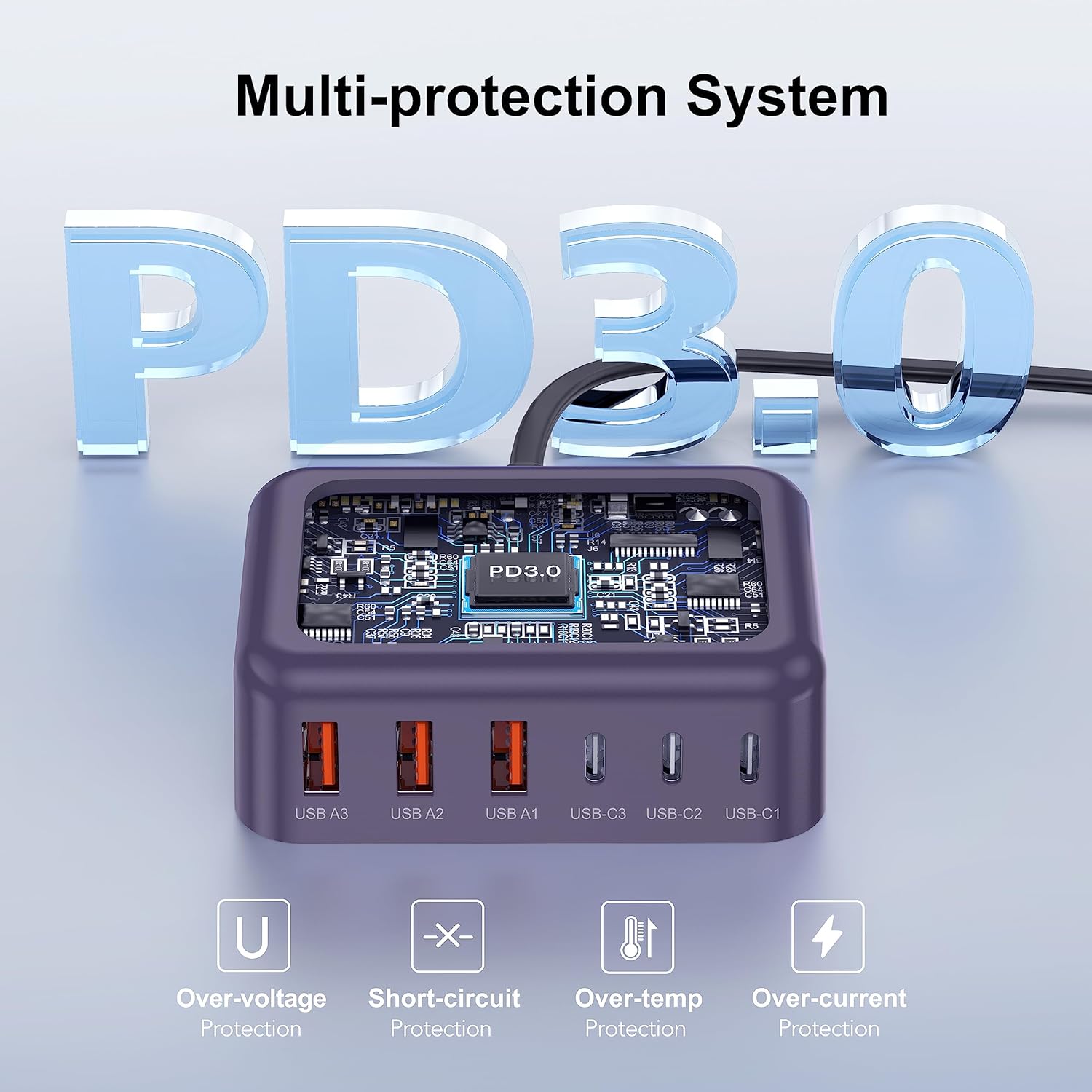 - âĄăFast-Speed Desktop Charging StationăOnly 30 minutes, charge your phone to 60%. 6 in 1 Charging blocks with 3 x USB C PD 3.0 port (20W max), 3 x USB port(18W max), this charger supports a maximum output of 100 watt in total. No need to wait, it can charge your watch, earphone, mobile phone, fan and other 6 different devices at the same time.