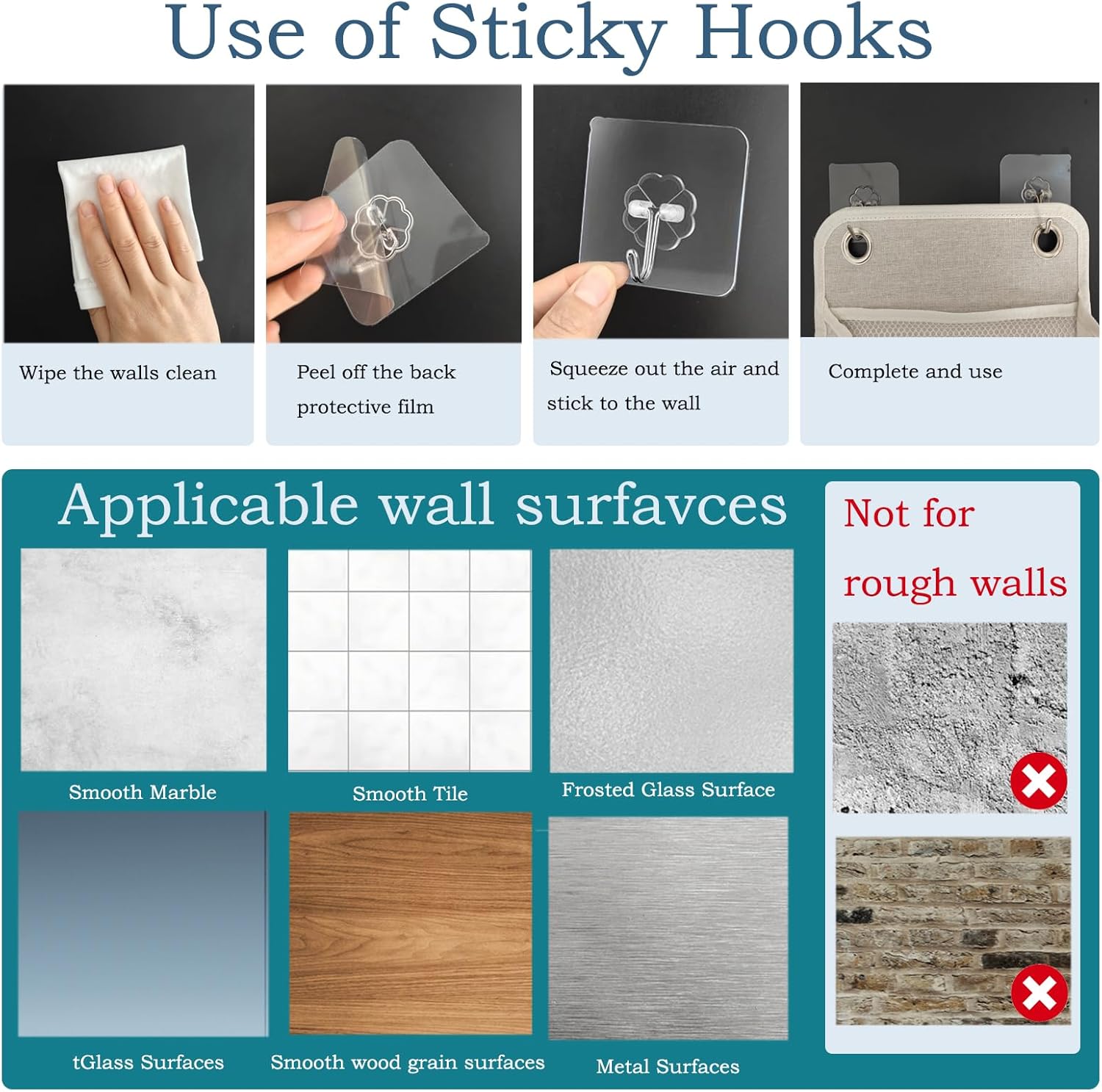 - The included clear adhesive hooks are easy to use by simply peeling the sticker off the back of the hook, sticking it where you need it, and pressing hard to remove the air bubbles.