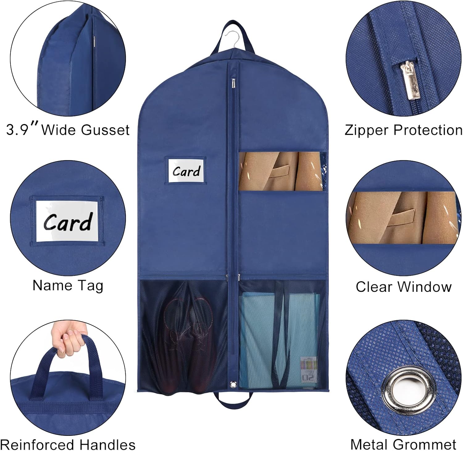 - Suit bags for closet storage with a Plastic PVC card/tag holder for identification; the clear window allows you to see which suit is inside without opening the bag, double handles allow you to transport without dragging your full-length women dresses / gown on the ground.