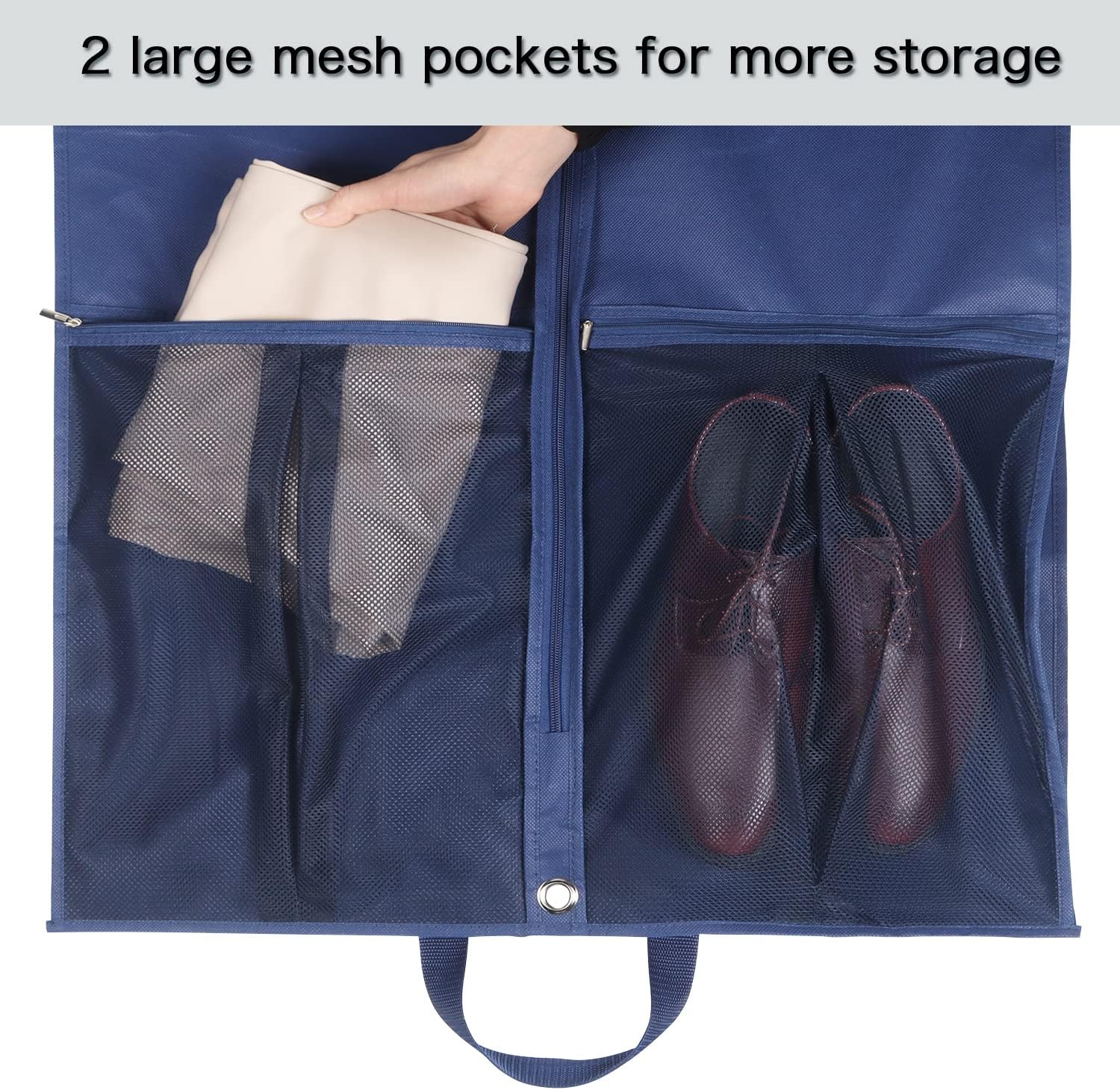 - 2 large breathable pockets at the bottom of the suit bag are big enough for a pair of ankle boots in one side and a change of clothes in the other side or store your accessories of garment, it can save your time when search the matched accessories, such as shoes, shirts, ties, bags, scarves.