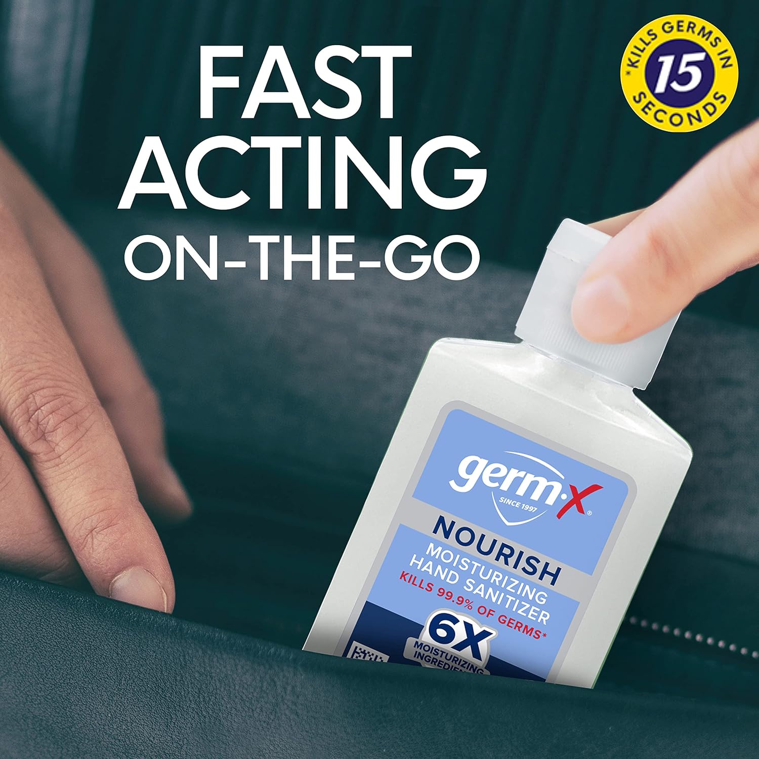 - Tough on Germs. Easy on Skin: Germ-X Nourish Moisturizing Hand Sanitizer contains rich moisturizers to hydrate and soften skin. Fast and effective, it kills 99.99% of many common germs without water in as little as 15 seconds, moisturizing with every use