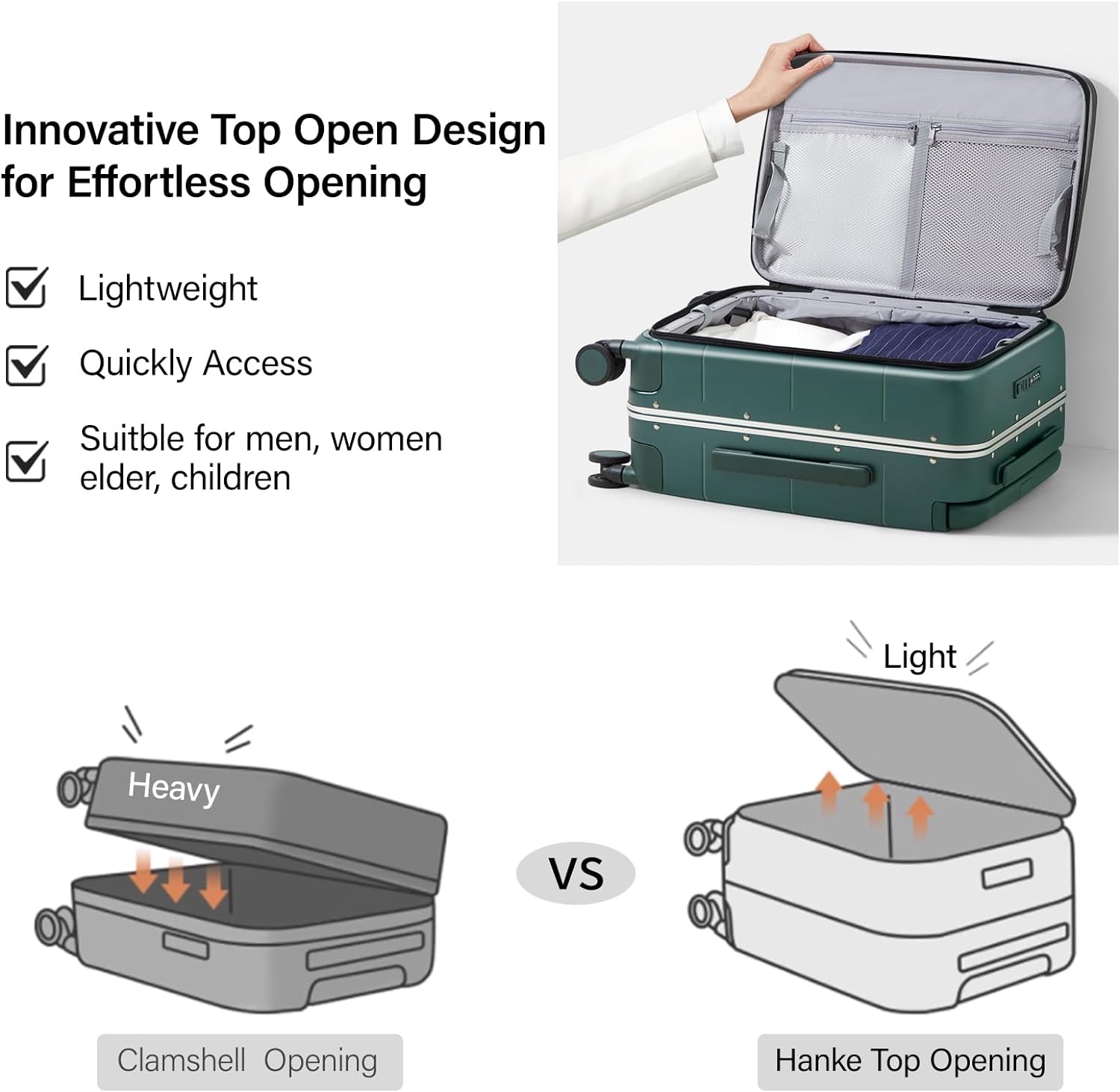Hanke Top Opening Carry On Luggage, 20 Inch Zipperless Aluminum Frame Wide Handle Luggage, All-PC Hard Shell Trunk Suitcase with Spinner Wheels, TSA Airline Approved (Blackish Green, 40L)