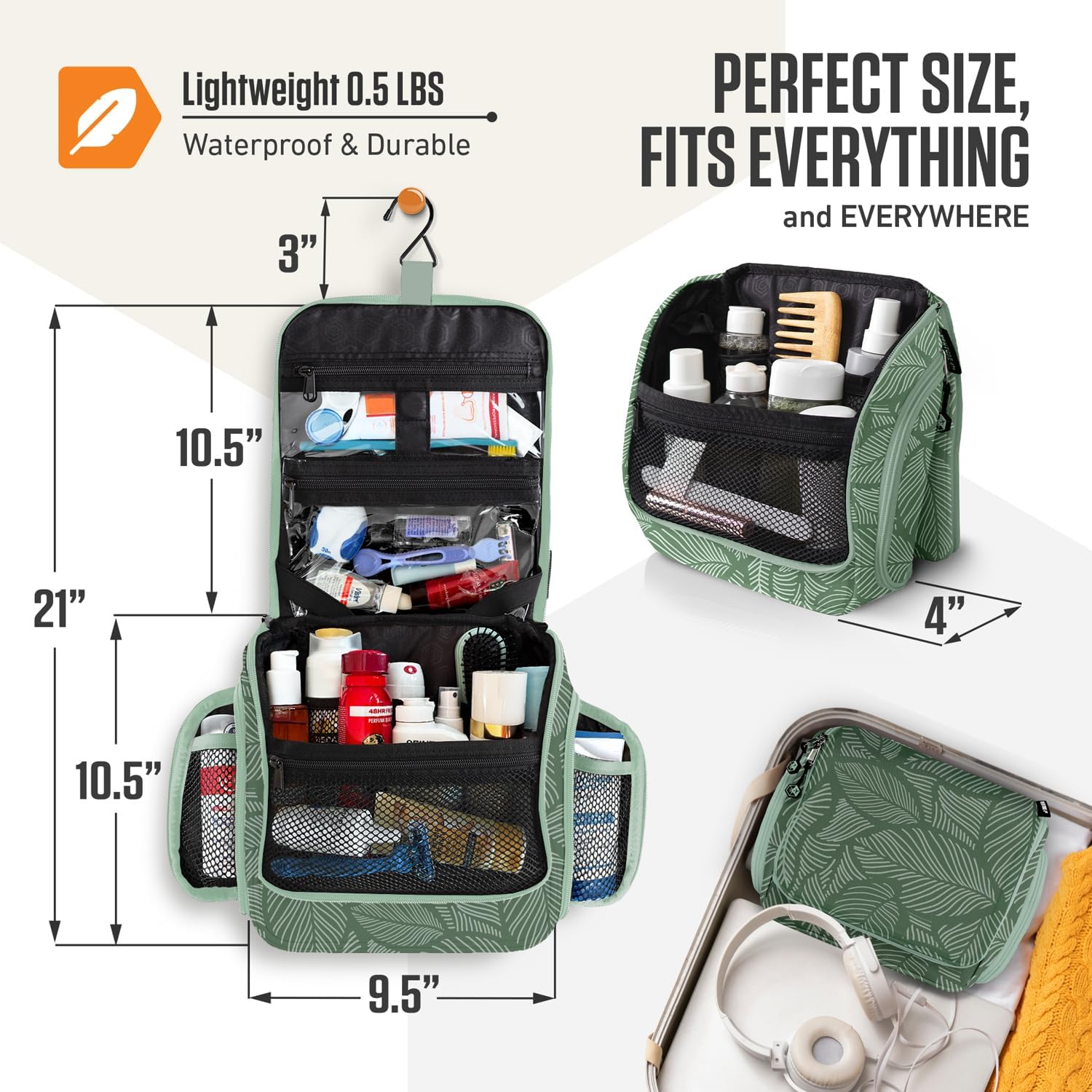 VENTURE 4TH Hanging Travel Toiletry Bag for Women & Men - Travel Organizer with Expandable Compartments & Removable Clear Pouch for Toiletries (Green Leaves)