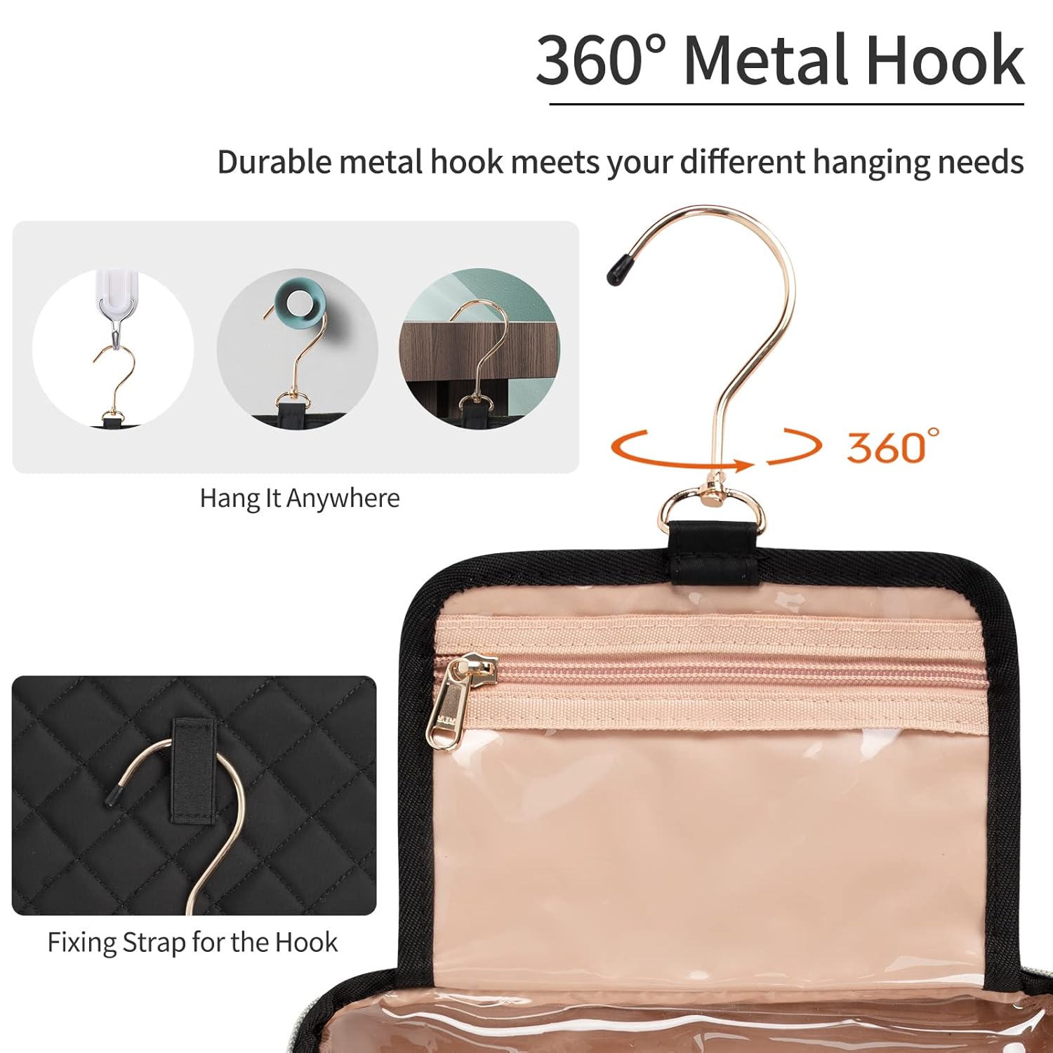 - CONVENIENT HANGING - The sturdy and durable metal hook is perfect to hang the toiletry bag anywhere so it doesn't take up a lot of counter space. Large diameter 360° swivel metal hook for versatile hanging options. It can even be hung on doors.