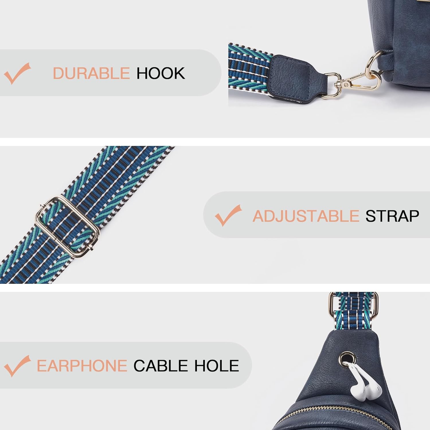 - High-Quality Material: Sling bag for women made with premium faux leather and designed with vintage embroidered shoulder straps, both functional and stylish. This fanny pack crossbody bags for women allows you to carry around all your essentials hands-free while matching any outfit and keeping a chic look. A small opening on the front holds your headphone cable or charging cable in place, so you can enjoy music or charge your phone easily
