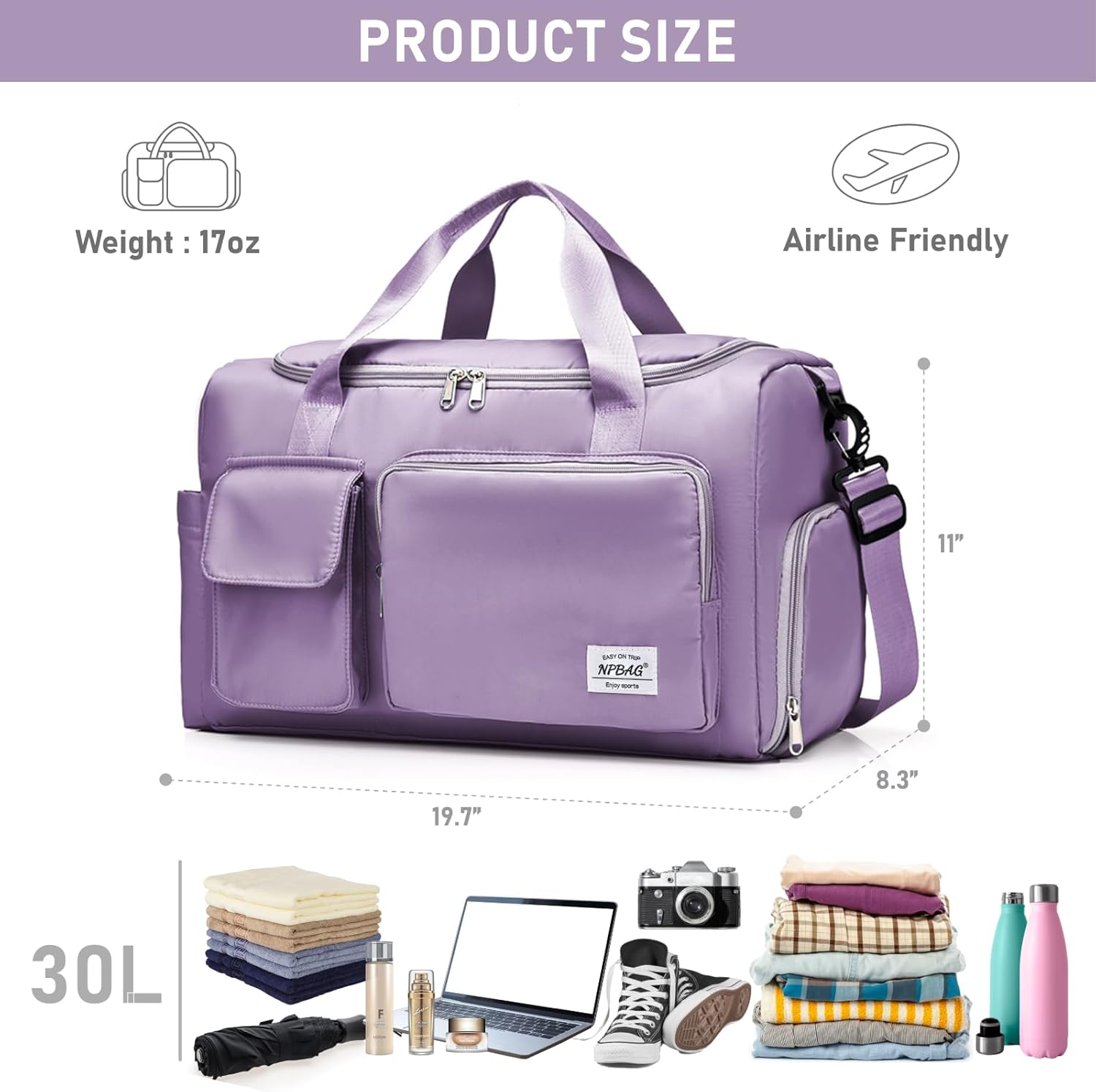 • DRY/WET SEPARATION DESIGN: It measures 19.7"(L) X 8.3"(W) X 11"(H) with large space for your gym and travel essentials. This duffel bag has a separate leakproof pocket which dividing your wet clothes, towels or cold drinks by water resistant lining. It keeps your items clean and well organized.