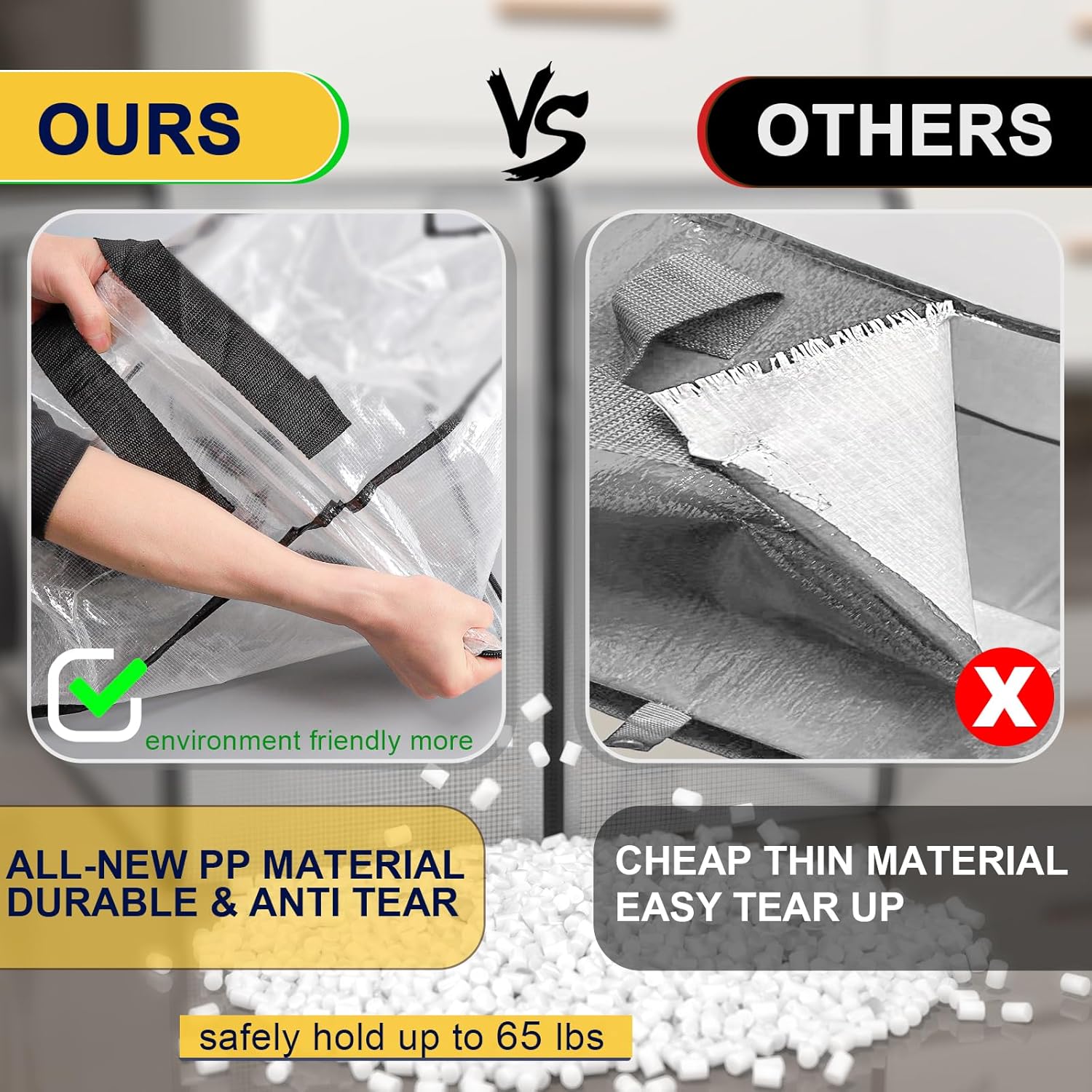 - Heavy-Duty & See Through Clear: High clear transparency material made, the contents in from all sides visible. Convenient for home organization and closet storage, quickly identify the different items stored inside, effortless and convenient . Multiple upgraded handles along with super strong nylon layers support easily up to 60-80lbs. Enjoy your space saving journey with this clear heavy-duty space saving/moving bag.