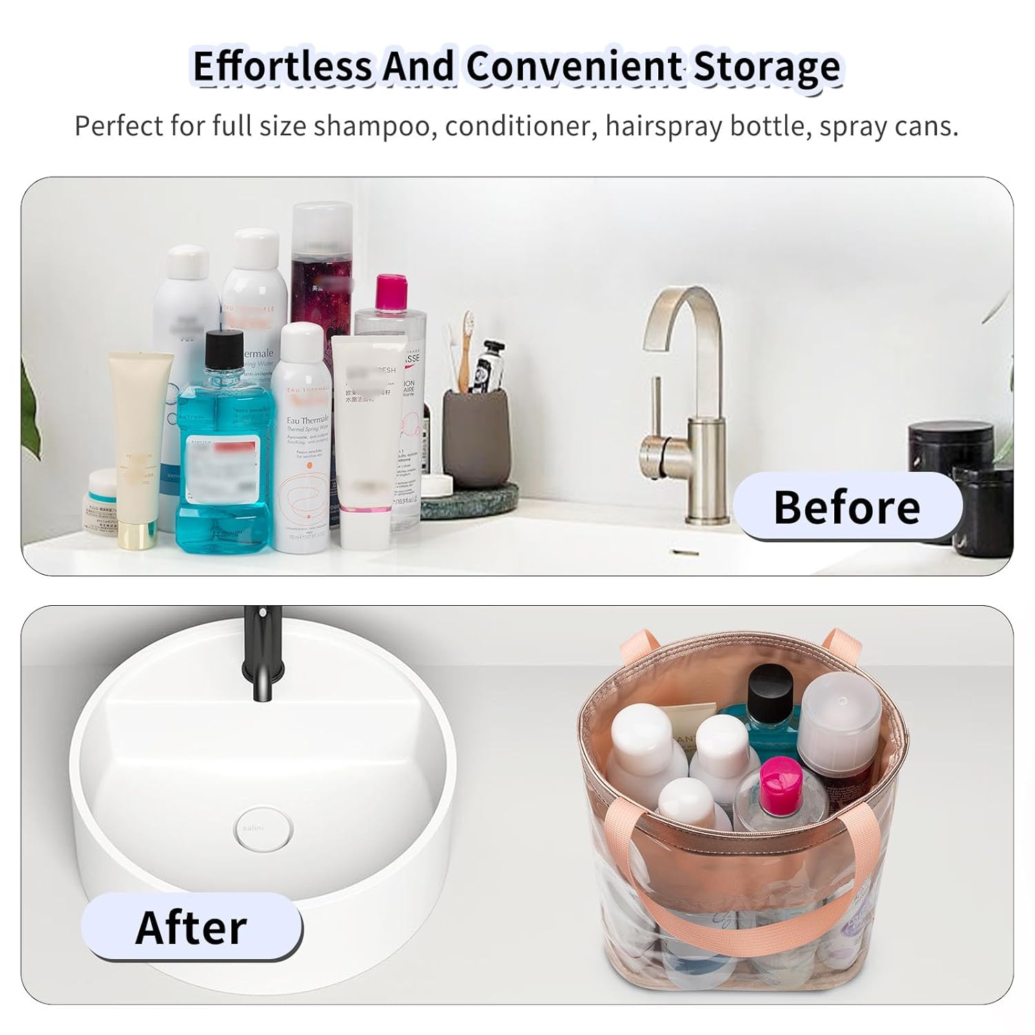 - Large Capacity -- Size: 8.3*4.7*10.6 inch, clear toiletry bag is designed to hold all your personal essentials in one place: full-size shampoo bottles, beauty products, medicines, shaving cream, razors, hair dryers, makeup, dental care, body lotion, baby care products and more.